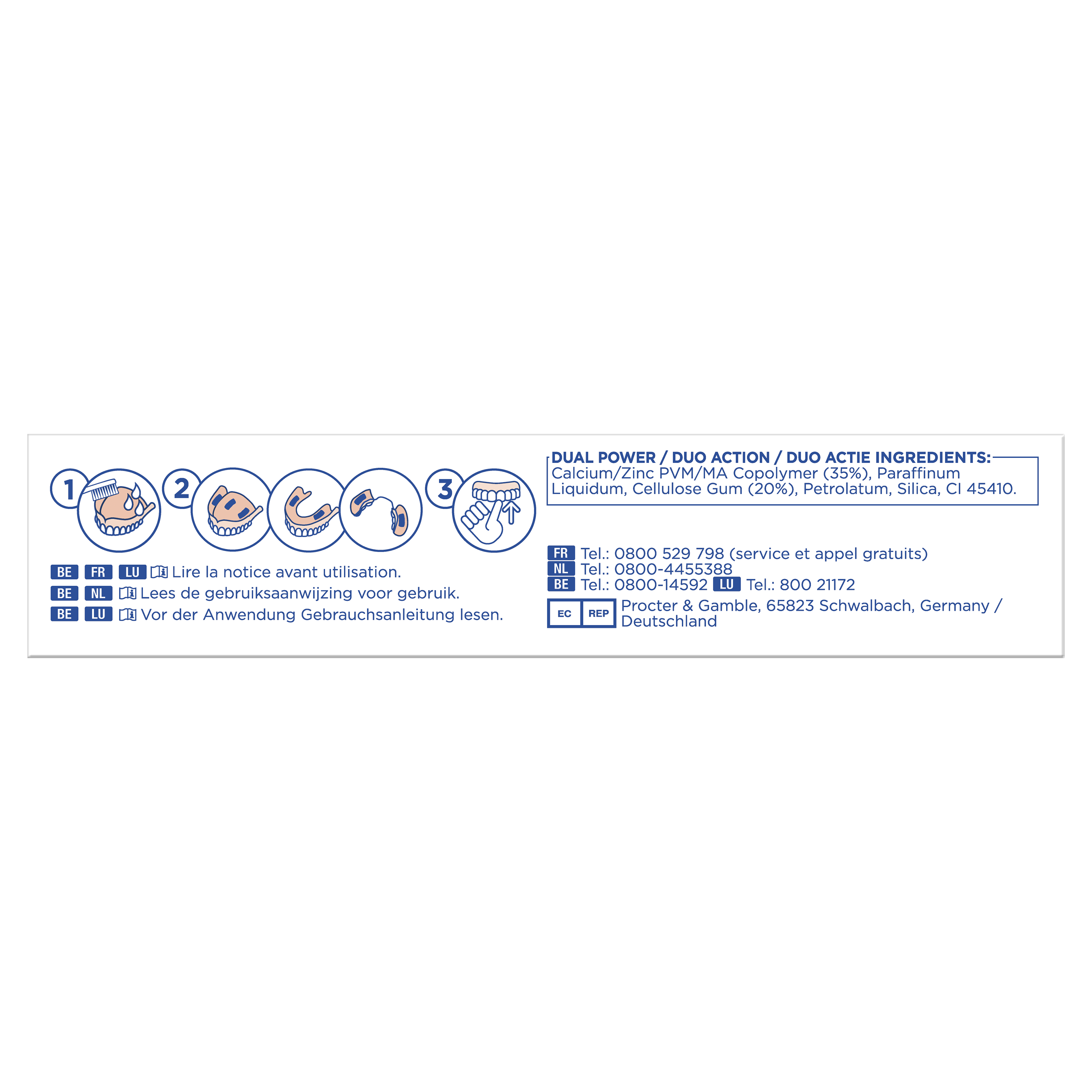Consignes d’utilisation : 1. Nettoyez minutieusement votre prothèse dentaire et vos gencives. 2. Pour des résultats optimaux, appliquez des points de crème adhésive à intervalles réguliers sur les bords et la surface de la prothèse dentaire en contact avec votre bouche. 3. Rincez-vous la bouche avec de l’eau avant d’insérer votre prothèse dentaire. Notre crème adhésive pour prothèses dentaires est conçue pour réagir avec l’humidité afin de former une barrière fine et serrée contre les résidus alimentaires. 4. Positionnez la prothèse fermement et maintenez-la en place pendant un court moment. 5. Pour des résultats optimaux, attendez 15 à 30 minutes avant de manger ou boire.