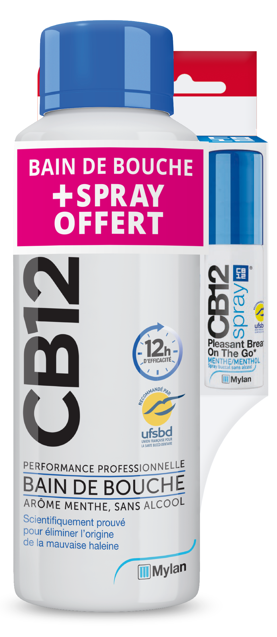 Offre découverte contenant un bain de bouche cb12 mint 500 ml + un spray cb12 offert. cb12 arôme menthe bain de bouche sans alcool agit contre l’origine de la mauvaise haleine et prévient sa réapparition en neutralisant les composés sulfurés volatils dans la bouche. Cb12 spray rafraîchit l'haleine instantanément. sa formule unique brevetée neutralise les mauvaises odeurs. L'association de la chlorhexidine et de l'acétate de zinc permet de combattre les processus buccaux responsables de la mauvaise haleine.