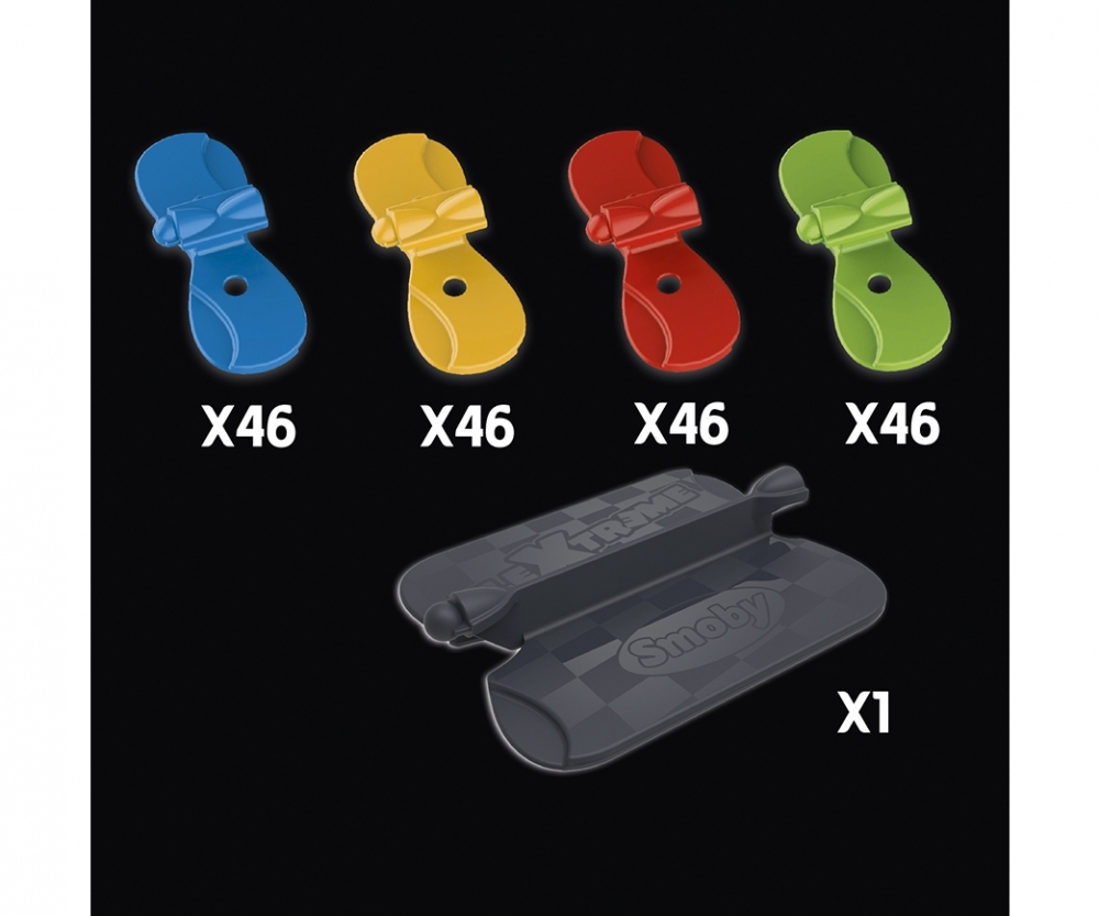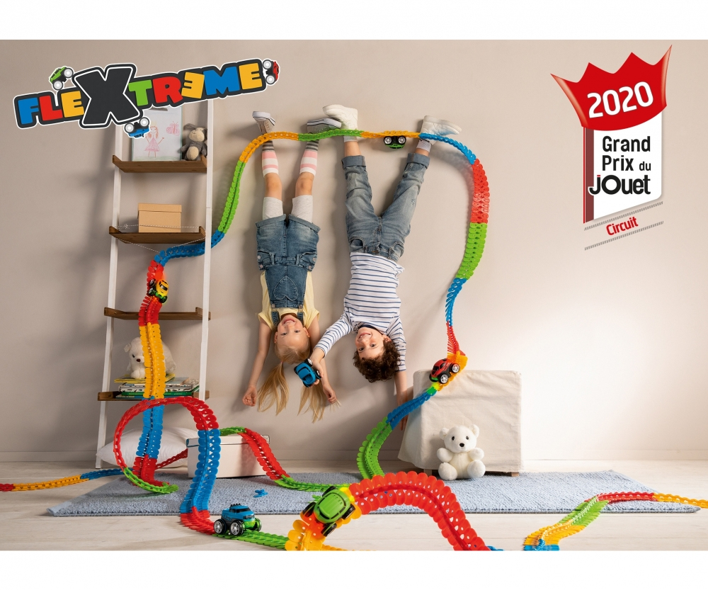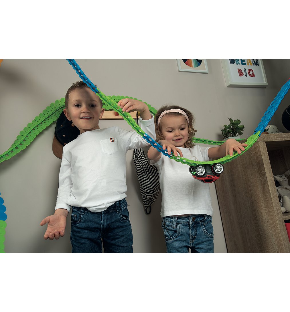FleXtreme est un tout nouvel univers mettant au défi la créativité de l'enfant. Composé de pistes flexibles et de véhicules, l'enfant peut créer un circuit en assemblant les pièces les unes aux autres. Grâce à sa créativité et à l'environnement qui l'entoure, il peut réaliser le circuit le plus incroyable possible. Les pistes s'emboitent facilement et sont tellement flexibles que l'enfant peut faire passer ses pistes au-dessus d'une chaise, de son lit, ou encore de sa commode. Mais pas seulement ! Looping, à l'envers, sur le côté... Set découverte composé de 184 pistes soit un circuit flexible de 4 mètres 40, d'un véhicule, d'une carrosserie supplémentaire, et d'une piste entrée/sortie. Piles incluses. A partir de 4 ans.