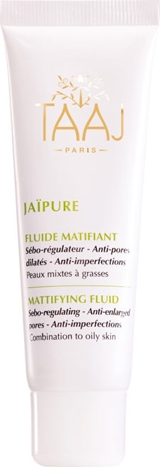 Taaj Jaïpure Fluide Matifiant 50 ml à base d'eau de source de l'Himalaya, à la texture légère et non grasse répond au problèmes des peaux mixtes et grasses : excès de sébum, pores dilatés, imperfections, irritations et rougeurs. Grâce à sa synergie d'actifs : Brahmi, Neem, Eau de Ciste, Huile de Noisettes, Arrow-Root, ce gel frais matifie immédiatement la peau sans la dessécher. La peau est nette, apaisée et hydratée, le grain de peau est affiné et le teint est plus lumineux.