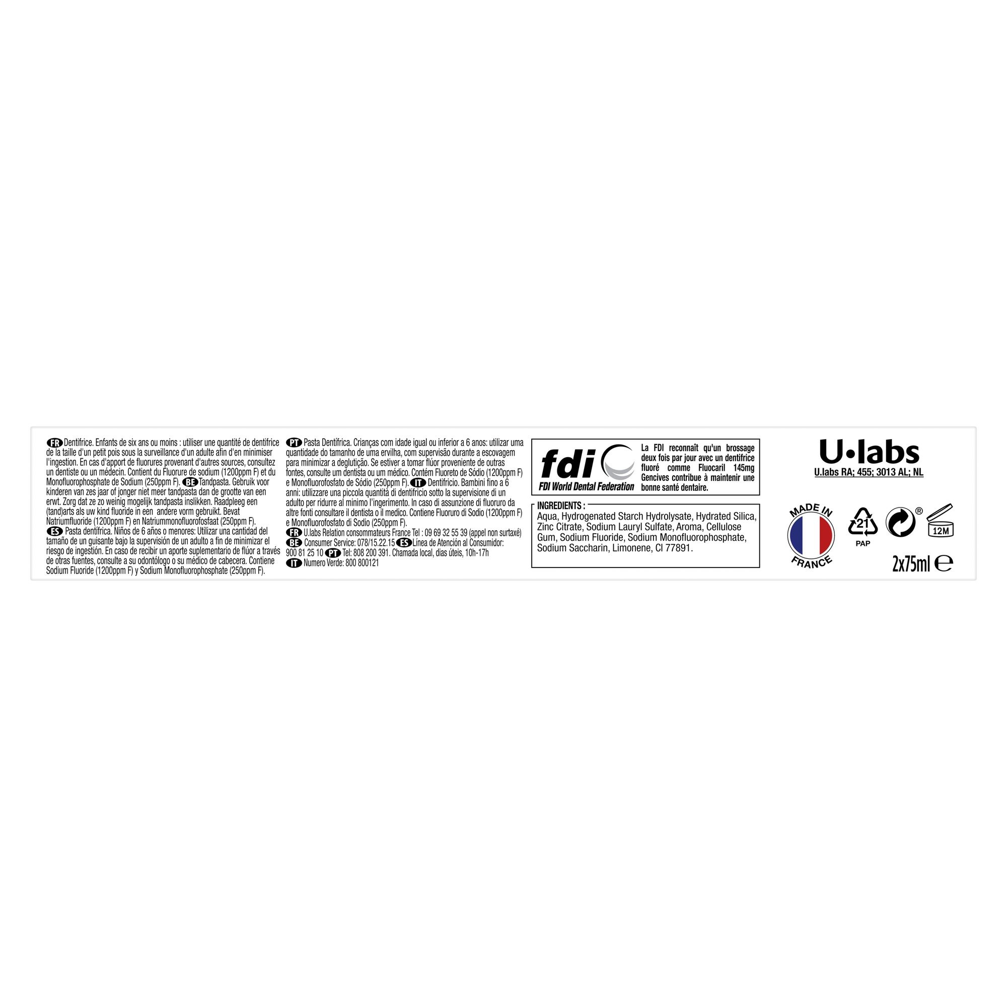 Ingrédients :Aqua, Hydrogenated Starch Hydrolysate, Hydrated Silica, Zinc Citrate, Sodium Lauryl Sulfate, Aroma, Cellulose Gum, Sodium Fluoride, Sodium Monofluorophosphate, Sodium Saccharin, Limonene, CI 77891.