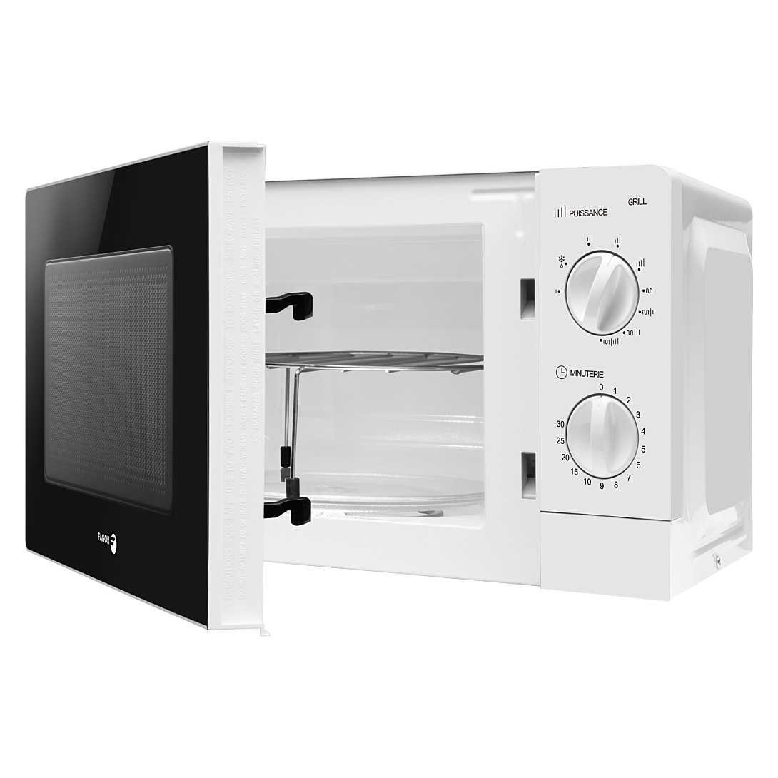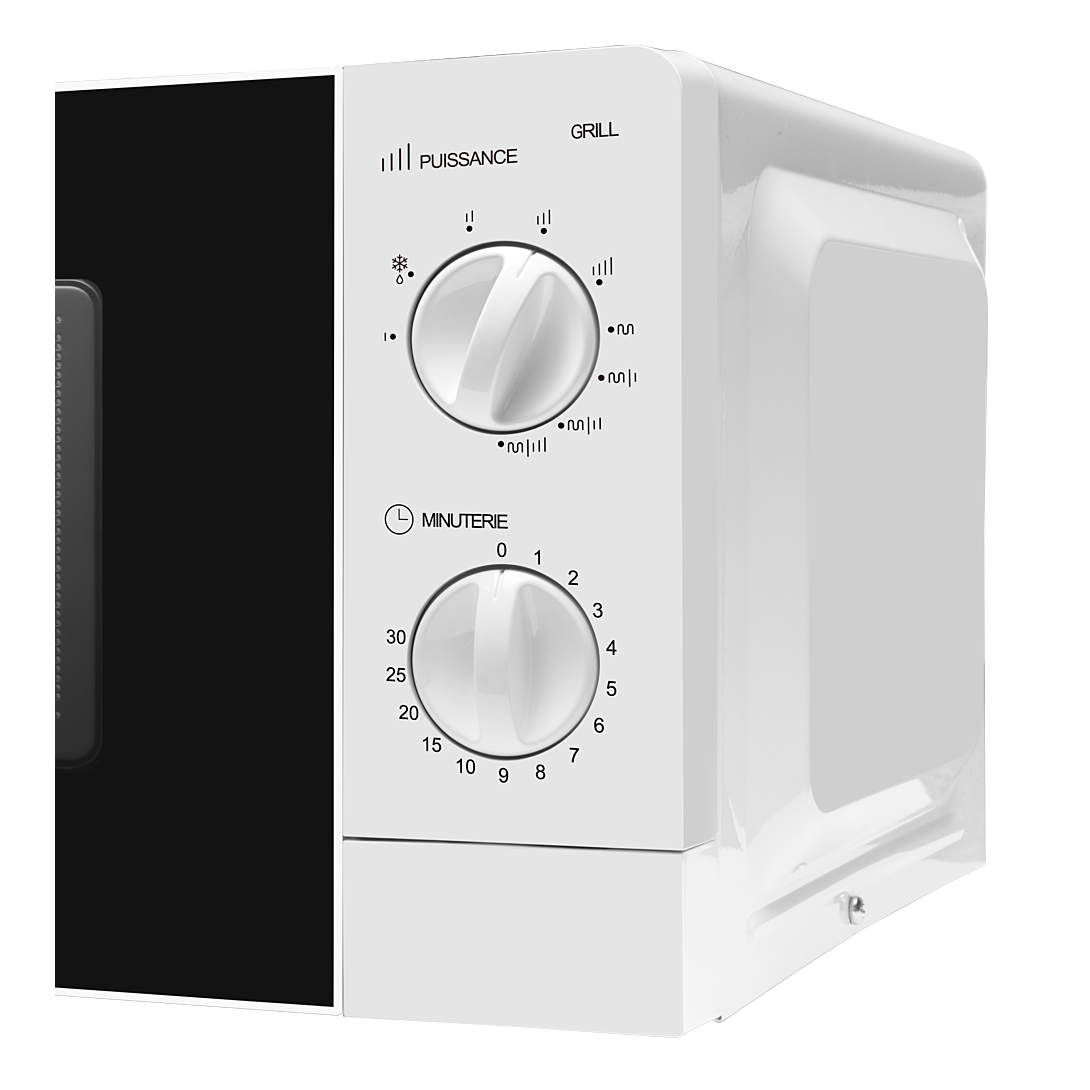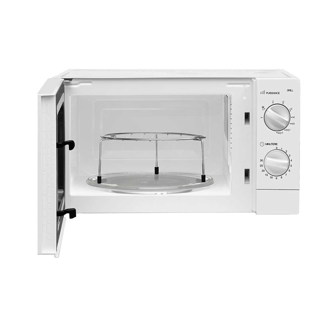 Micro-ondes gril 20L Blanc, Commandes par manette 700W, porte tempérée - 2 verres, 6 niveaux de puissance,» Minuterie : 30 min, Éclairage, Plateau en verre : 24,5 cm