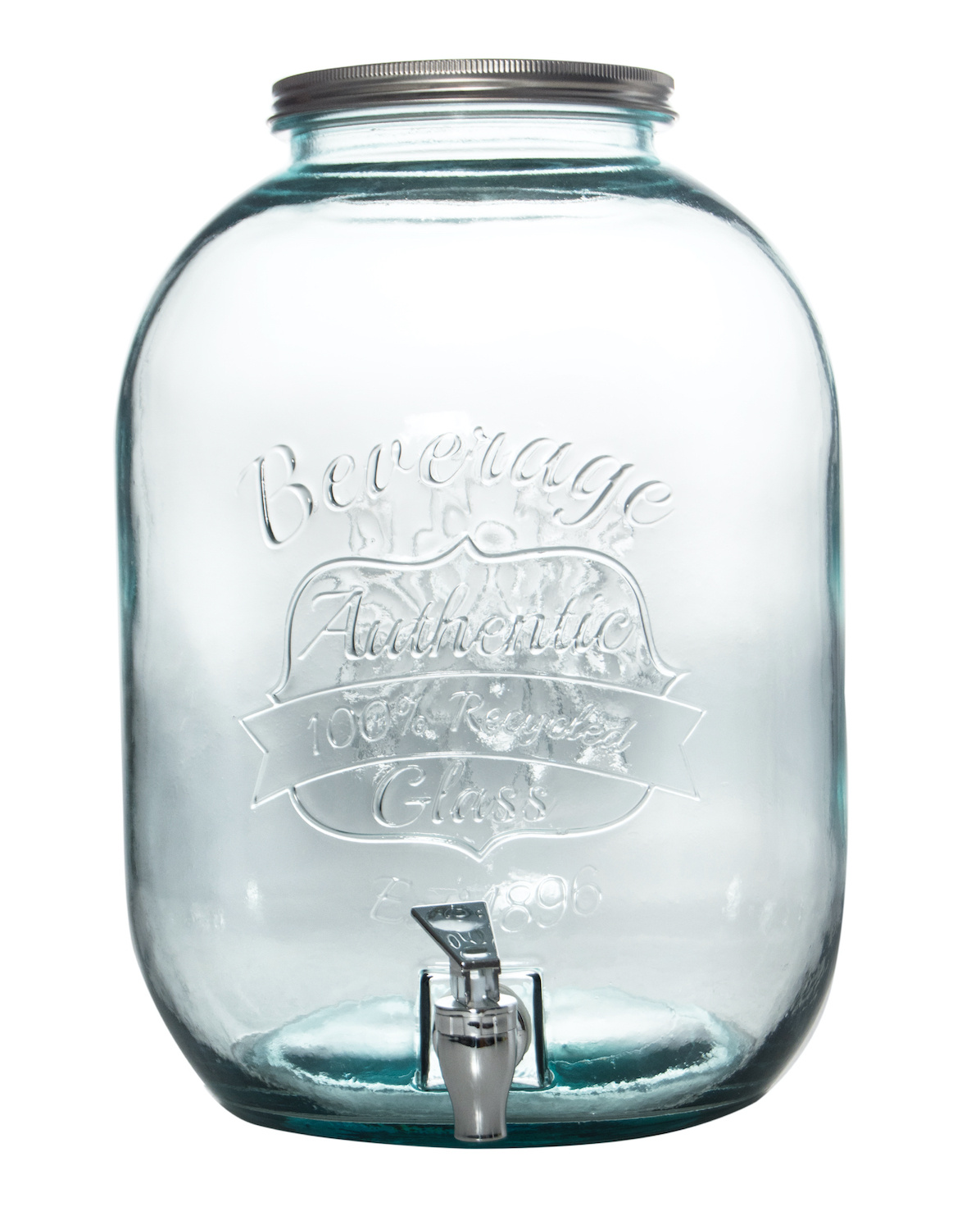 Fontaine à boisson de 12,5L en verre 100% recyclé post consum et fabriquée en Espagne. La fontaine est dotée d'un robinet et d'un couvercle à vis. Idéale pour tout type de boissons (jus, eau aromatisée, cocktail, ...). Son format permet d'être utilisé pour de simples repas en famille ou pour tout type d'évènement. Le verre 100% recyclé post consum donne à cette fontaine à boisson un rendu magnifique et permettra (en plus d'être pratique), d'habiller votre table ou buffet.