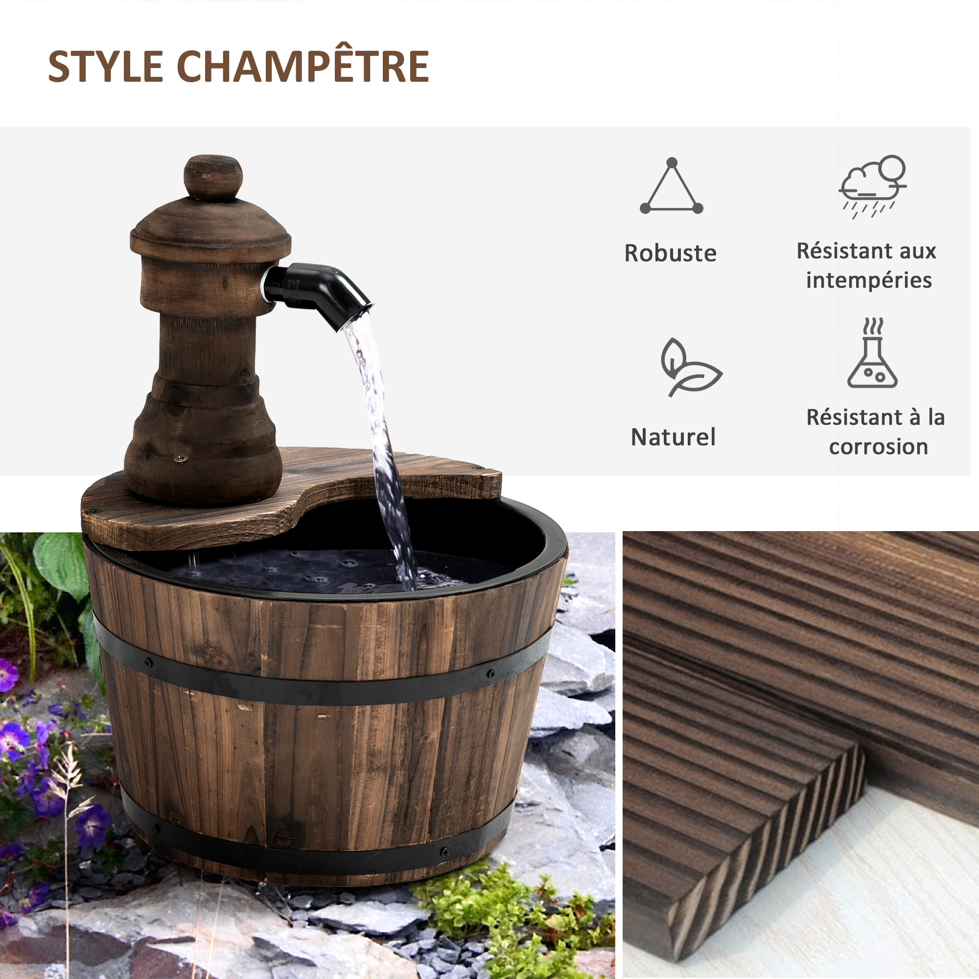 | Libellé | Fontaine de jardin tonneau pompe à eau submersible incluse diam. 27 x 37H cm bois de pin marron |