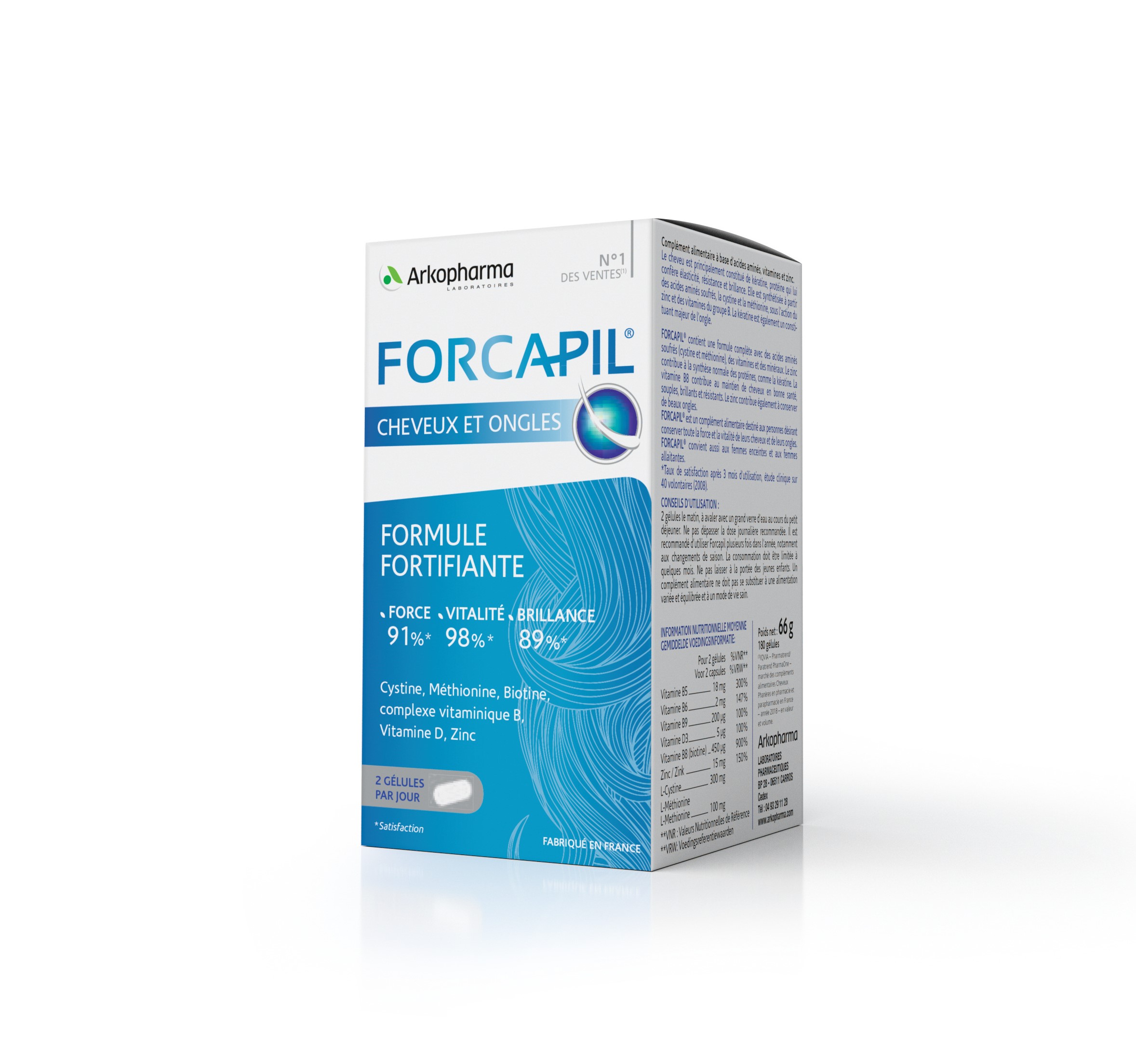 Des cheveux ternes et sans volume ? Des cheveux et des ongles cassants ? Forcapil, formule fortifiante est une association d’actifs qui apporte Force, Vitalité et Brillance à vos cheveux et vos ongles. Élu comme étant « Le produit préféré des Français »*, Forcapil propose une formule complète pour vos ongles et vos cheveux ! 98 % des volontaires ont été satisfaits par l'amélioration de l’état général de la chevelure au bout de 3 mois d’utilisation Source : Étude clinique réalisée pendant 6 mois sur 40 sujets.