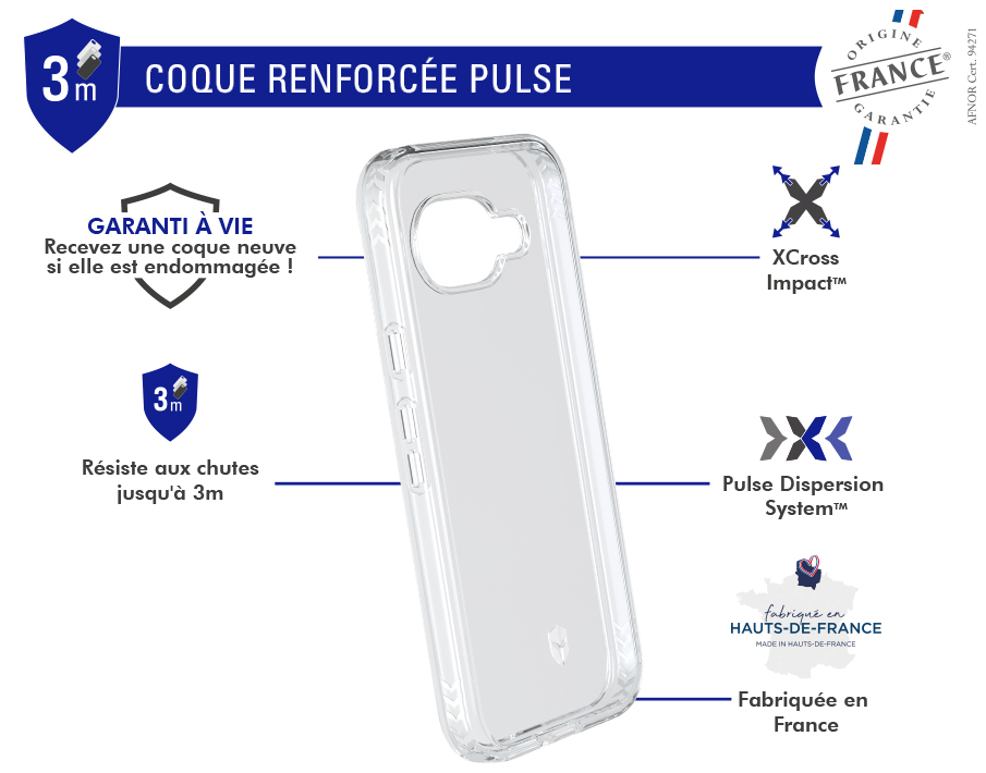 Protégez votre Google Pixel 9A avec cette coque renforcée modèle Pulse 3m de Force Case. Elle a été rigoureusement testée pour résister à des chutes allant jusqu'à 3 mètres, grâce à la combinaison de deux technologies innovantes et de matériaux premium : XCross Impact qui diffuse uniformément l'onde de choc et Pulse Dispersion System avec ses inserts 3D qui absorbent et dispersent les chocs latéralement.