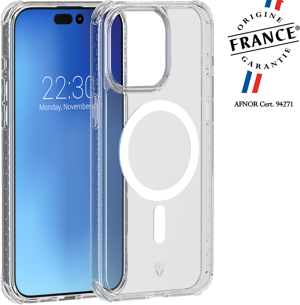 • Système aimanté renforcé compatible MagSafe. Compatible Force Glass