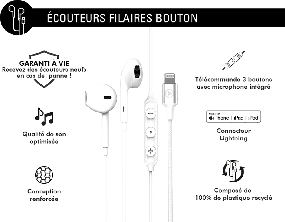 Conçus pour durer grace à leur conception renforcée Ces écouteurs sont conçus pour être résistants. Le câble en nylon tressé est plus solide et résistant à l'usure, il est moins susceptible de s'emmêler ou de se casser. Le revêtement métallique sur le connecteur, quant à lui, ajoute une couche de protection supplémentaire contre les dommages causés par une utilisation quotidienne, comme les frottements ou les chocs. Une qualité de son immersive Grâce une fréquence large (20Hz-20kHz), la restitution du son est excellente, avec des basses et des aigus bien équilibrés pour une expérience audio immersive. L'impédance modérée de 32? améliore la pureté du son pour une meilleur transmission sonore. Que ce soit pour vos musiques, vos séries ou bien des jeux vidéo, la qualité sonore est idéale pour ne ressentir aucune fatigue auditive, même lors d'une écoute prolongée. Légers et compacts : pratiques pour une utilisation quotidienne. Ils vous permettent de profiter de la musique, des podcasts, des appels téléphoniques et d'autres contenus audio où que vous soyez : dans la rue, au bureau, à maison, dans le métro ou même lors de vos activités sportives. Microphone intégré pour les appels et enregistrement vocaux Un microphone est intégré dans la télécommande des écouteurs, vous permettant de réaliser des appels téléphoniques en mode mains libres à tout moment, sans avoir besoin d'accéder à votre appareil. Pratique aussi pour enregistrer tous vos vocaux. Télécommande 3 boutons pour un contrôle facile et intuitif Avec la télécommande intégrée sur le câble des écouteurs, plus besoin de sortir votre appareil pour contrôler vos musiques et vos appels. Multifonctions, avec un simple clic suffit pour tout controler : lecture, pause, décrocher, régler le volume, etc Câble d'une longueur d'1.2m Son câble d'une longueur d'1.2 mètre est parfaitement adapté à une utilisation nomade. Ni trop court ni trop long, il permet une liberté de mouvement confortable et pratique. Plus encore, il facilite vos branchements en toutes circonstances. Format bouton : Ergonomie et Confort d'écoute inégalable Grâce à leurs embouts ergonomiques, ces écouteurs s'ajustent parfaitement à la géométrie de vos oreilles. Ils ne procurent qu'une gêne minimale lorsque vous les utilisez sur de longues périodes. Ces écouteurs sont la solution idéale pour profiter de votre musique tout au long de la journée et aussi longtemps que vous souhaitez. Compatible avec les appareils équipés de port Lightning Pour profiter des tous vos contenus, ces écouteurs filaires sont compatibles avec une grande variété d'appareils iOS équipés d'un port Lightning, tels que les smartphones, tablettes ou ordinateurs portables. Ils offrent une grande polyvalence pour une utilisation quotidienne. Authenticité et certification MFi La certification MFi (Made for iPhone, iPad, and iPod) garantit une compatibilité de charge et de synchronisation parfaite avec votre appareil Apple.
