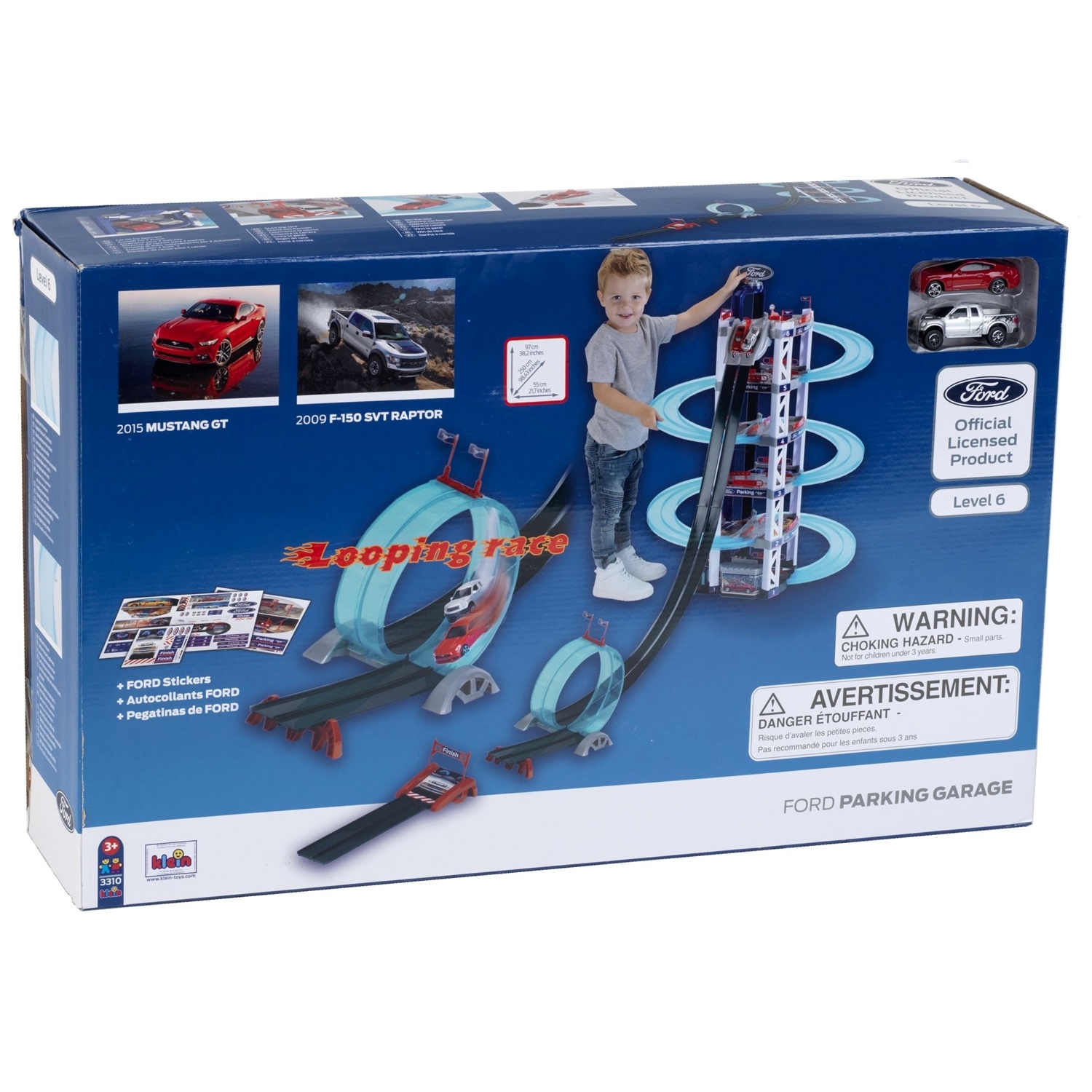 Theo Klein 3310 Ford Garage 6 Niveaux avec Looping - - Laissez vous séduire par ce superbe garage qui réalisera tous vos rêves : il propose des places de parking sur six niveaux élégamment accessibles par ascenseur. Mais le idéal moment n'est cependant pas d'arriver en haut, mais plutôt de redescendre en trombe. Une rampe vertigineuse propulse les véhicules dans un looping dément avant de s'élancer sur le pont basculant et d'atterrir sur la ligne d'arrivée. Après une telle descente, passage obligé à la station de lavage automatique avant de faire le plein de carburant et de reprendre l'ascenseur pour de idéales courses effrénées. Ce suberbe garage FORD au design très original est fabriqué dans un plastique de qualité inégalable, avec un amour du détail qui permettra aux enfants des heures de jeu passionnant et insouciant. Ce qui contribue à entraîner leur motricité, leur coordination œil-main et leur imagination. Garage Ford 6 niveaux avec looping Ce magnifique garage Ford d'une hauteur d'un.ètre est équipé d'une rampe de départ à deux pistes pour des courses effrénées entre petits bolides, et qui peut être transformée en simple piste pour une plus grosse voiture qui la descendra élégamment. Arrivés en bas, les véhicules font un dernier looping avant de s'élancer sur le pont basculant et d'atterrir sur la ligne d'arrivée. Il est complété par un ascenseur, une pompe à carburant, une station de lavage automatique et deux petites voitures. - - - Dimensions : 250 cm x 55 cm x 100 cm - À partir de 3 ans
