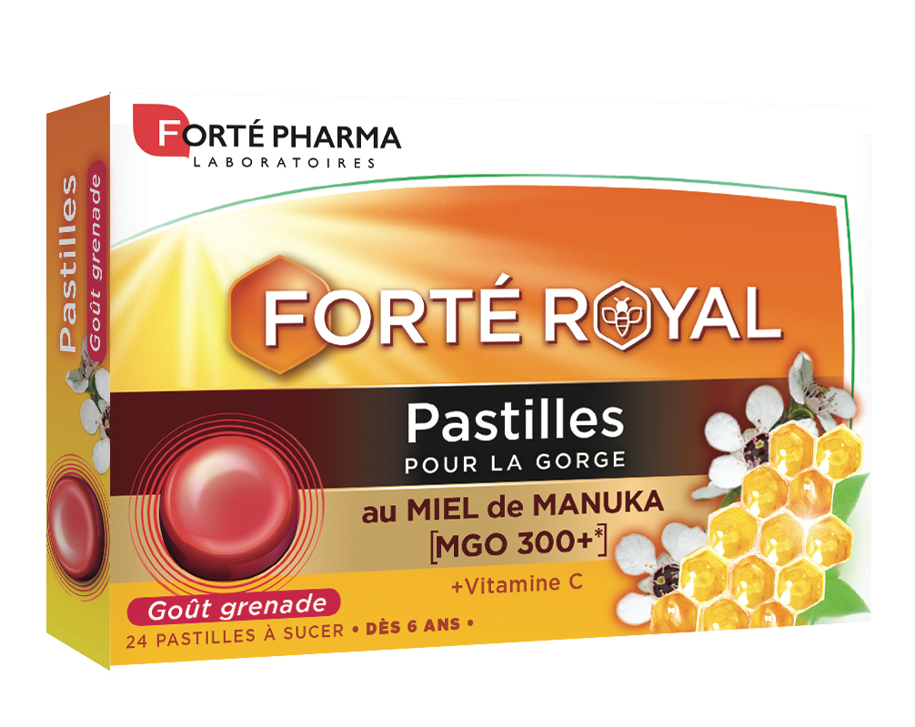Les Laboratoires Forté Pharma ont développé FORTÉ ROYAL Pastilles Manuka, des pastilles pour la gorge associant le Miel de Manuka et la Vitamine C pour vous offrir une solution naturelle. Le miel de Manuka est un miel d'une grande qualité, originaire de Nouvelle Zélande et traditionnellement utilisé par les Maoris pour ses vertus ancestrales remarquables. La courte période de floraison de l'arbre de Manuka, en fait un miel rare et d’exception. FORTÉROYAL Pastilles Manuka est enrichi en miel de manuka dont la teneur en MGO (méthylglyoxal) est d'au moins 300 mg par kilo de miel ce qui lui confère une efficacité et des propriétés uniques.