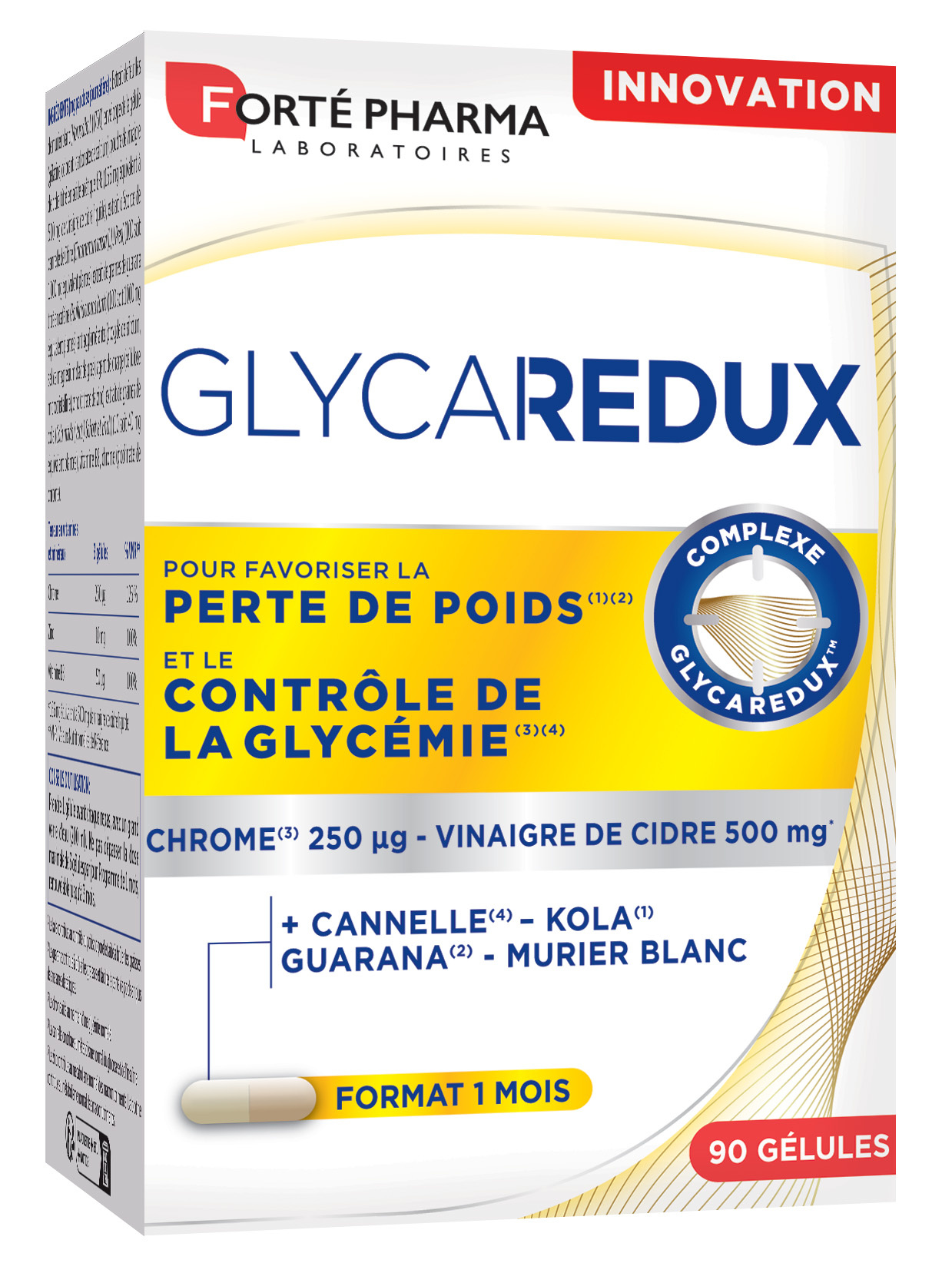 Les Laboratoires Forté Pharma ont développé GLYCAREDUX, un complément alimentaire à prendre avant chaque repas pour favoriser la perte de poids(1)(2) et le contrôle de la glycémie(3)(4). GLYCAREDUX contient 2 extraits de plantes qui contribuent à la perte de poids(1)(2) : • Du kola qui participe au contrôle du poids corporel et aide à brûler les graisses. • Du guarana qui aide à brûler les graisses et facilite la perte de poids. Le COMPLEXE GLYCAREDUXTM associe 6 actifs rigoureusement sélectionnés : • Du chrome qui aide au maintien d’une glycémie normale. • De la cannelle qui contribue au métabolisme normal du glucose et de l’insuline. • Du vinaigre de cidre qui est obtenu par fermentation des sucres des pommes ce qui les transforme en acide acétique, l’ingrédient actif du vinaigre. • Du murier blanc qui est utilisé depuis des siècles pour ses nombreux bienfaits, permettant d'apporter 4 mg de deoxynojirimycine (ou DNJ) par dose journalière. • Du zinc et de la vitamine B8 qui contribuent au métabolisme normal des macronutriments(5) (glucides, lipides, …). GLYCAREDUX l’allié bien-être et minceur qui vous accompagne à chacun de vos repas. GLYCAREDUX ne se substitue pas à une alimentation équilibrée. Retrouvez tous nos conseils nutritionnels sur la notice à l'intérieur du produit.