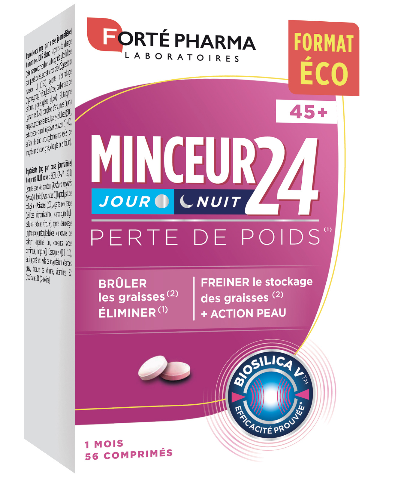 S’appuyant sur plus de 10 ans d’expertise en matière de chronobiologie minceur, une science qui définit les phases d’activités maximales et minimales des différents organes (foie, reins, pancréas…) sur un cycle de 24 heures, les Laboratoires Forté Pharma continuent d’innover avec Minceur 24 45+ Jour & Nuit. Le comprimé JOUR associe la prêle, qui facilite la perte de poids et agit sur les fonctions d’élimination, au piment qui aide à brûler et à déstocker les graisses. Le zinc contribue quant à lui au métabolisme normal des acides gras. Un complexe innovant, le Glutazyme, associant enzymes et acide aminé, a été ajouté au comprimé Jour pour améliorer l’assimilation des nutriments. Le comprimé NUIT contribue à réguler l’assimilation des sucres à l’aide du chrome qui participe au maintien d’une glycémie normale. Pour une action complète, ce comprimé contient du Biosilica-VTM* (une association de bambou et de riz), du collagène et de la vitamine B8 qui contribue au maintien d’une peau normale. S’ajoutent à la formule du CoEnzyme Q10 et de la vitamine B2, un antioxydant protecteur cellulaire. *Etude scientifique Biosilica-VTM MO/HA/TS – 46288-07 - 30 jours - 40 femmes.