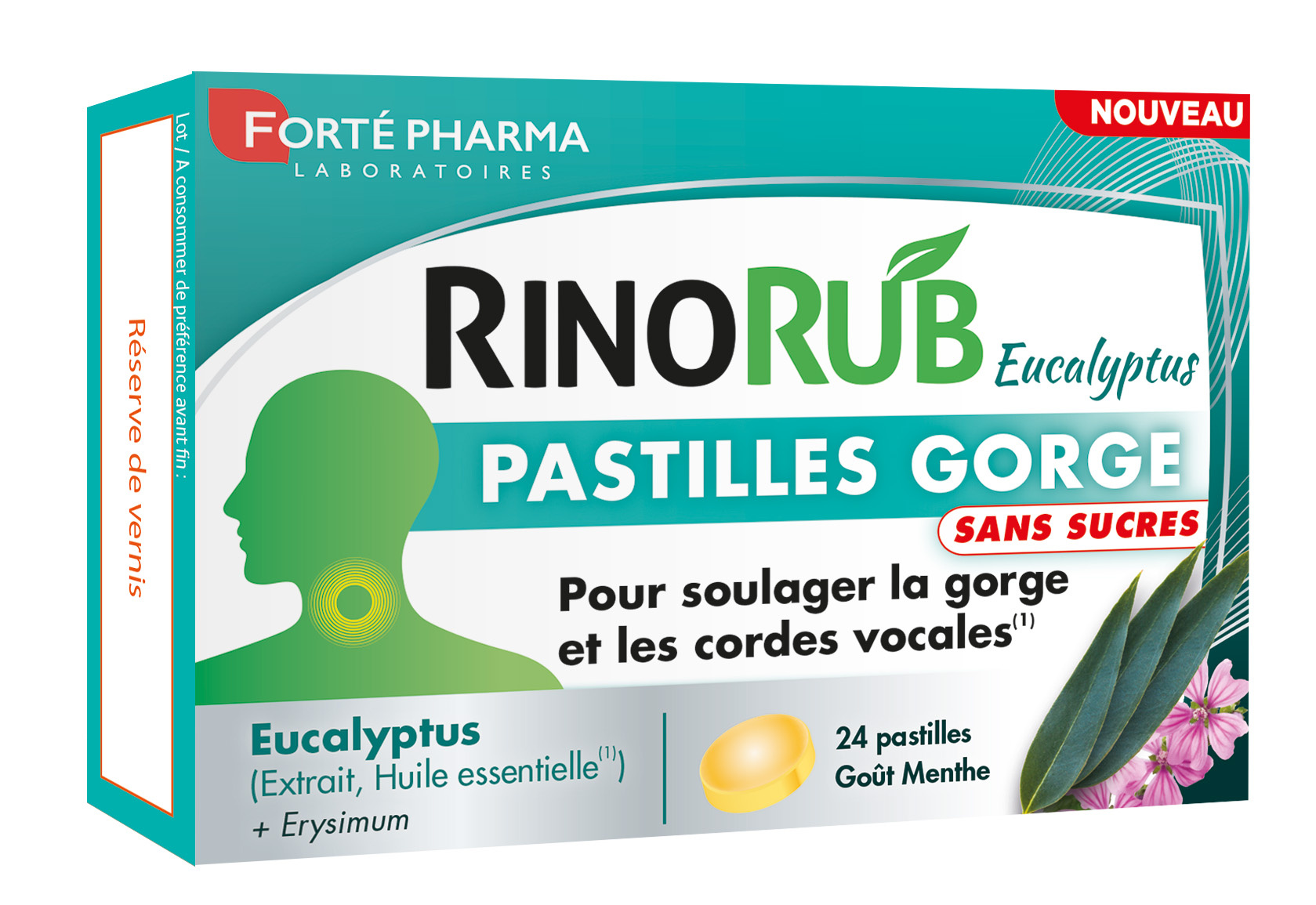 RINORUB Pastilles est une solution conçue par le Département Recherche & Développement des Laboratoires Forté Pharma pour aider à soulager la gorge et les cordes vocales(1) grâce à l’huile essentielle d’Eucalyptus qu’elle contient. Sa formule sans sucres au bon goût mentholé associe un complexe unique alliant : - Un extrait de feuilles d’Eucalyptus, - De l'huile essentielle d’Eucalyptus qui a un effet apaisant et agréable sur la gorge, - Et de l’Erysimum, une plante connue pour ses vertus. Avec RINORUB Pastilles, passez l’hiver sereinement !