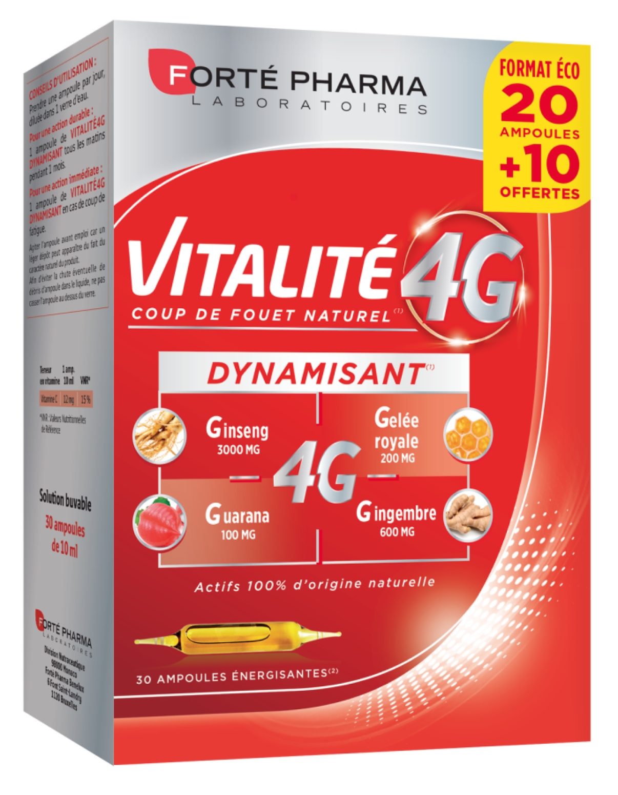 Prendre une ampoule par jour, pure ou diluée dans 1 verre d'eau. Pour une action durable : 1 ampoule de VITALITÉ 4G DYNAMISANT tous les matins pendant 1 mois. Pour une action immédiate : 1 ampoule de VITALITÉ 4G DYNAMISANT en cas de coup de fatigue. Agiter l’ampoule avant emploi car un léger dépôt peut apparaître du fait du caractère naturel du produit. Afin d’éviter la chute éventuelle de débris d’ampoule dans le liquide, ne pas casser l’ampoule au dessus du verre. Un complément alimentaire ne doit pas se substituer à une alimentation variée et équilibrée et à un mode de vie sain. Se conformer aux conseils d’utilisation. Ne pas dépasser la dose journalière conseillée. Tenir hors de portée des jeunes enfants. Déconseillé aux femmes enceintes ou qui allaitent et aux enfants de moins de 8 ans sans avis médical. Sans gluten, sans OGM, sans gélatine. A conserver dans un endroit sec et frais. Ce complément alimentaire n’est pas un médicament.