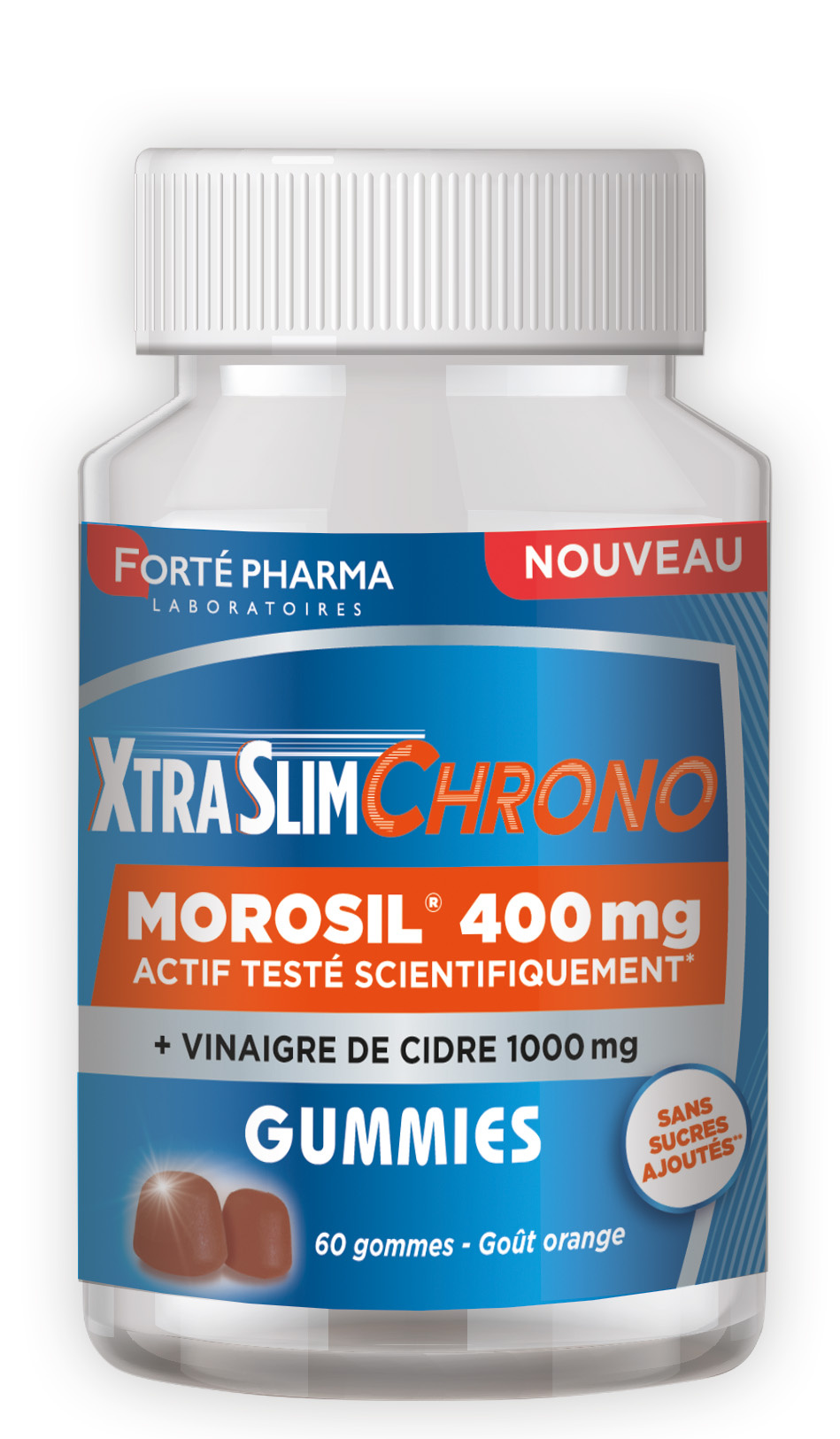 Les Laboratoires Forté Pharma ont développé XTRASLIM CHRONO GUMMIES, un complément alimentaire associant du MOROSIL® et du vinaigre de cidre. Le MOROSIL® est un extrait issu d’oranges sanguines. Il s’agit d’un actif testé scientifiquement* démontrant des bénéfices sur la silhouette. Le vinaigre de cidre est obtenu par fermentation des sucres des pommes, ce qui les transforme en acide acétique, l’ingrédient actif du vinaigre. Avec XTRASLIM CHRONO GUMMIES alliez plaisir et minceur grâce à son format gummies pratique, son bon goût orange et son dosage en actifs de référence.