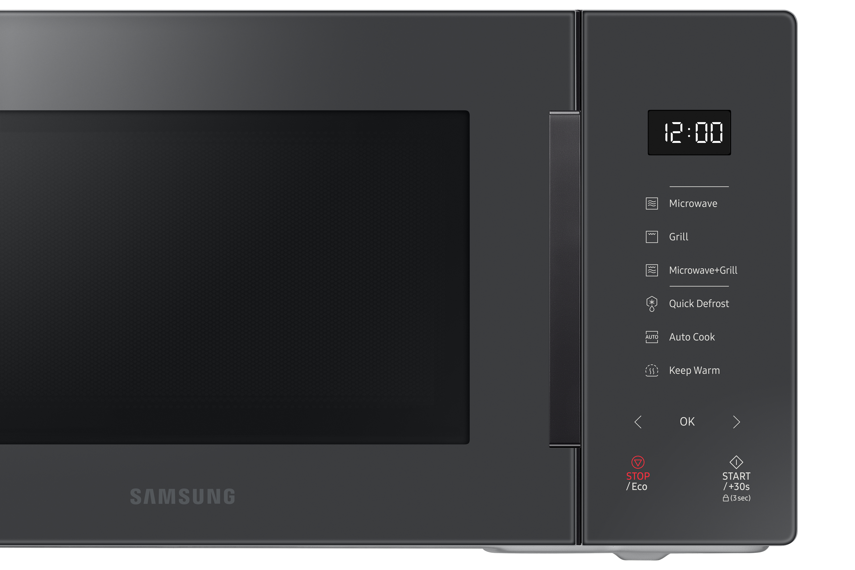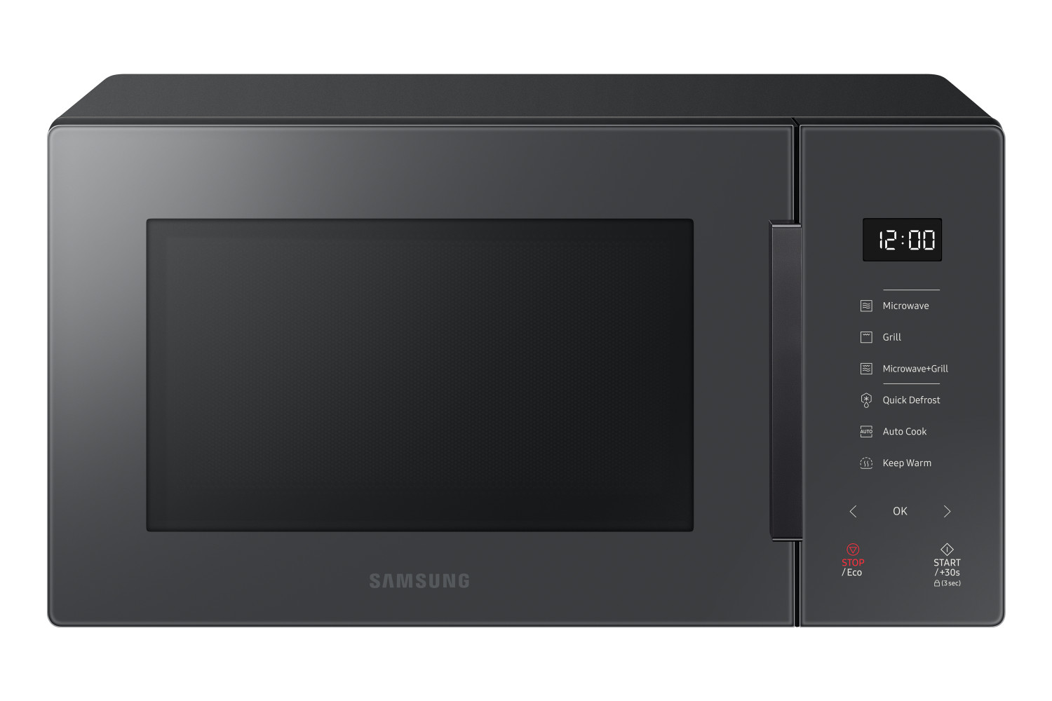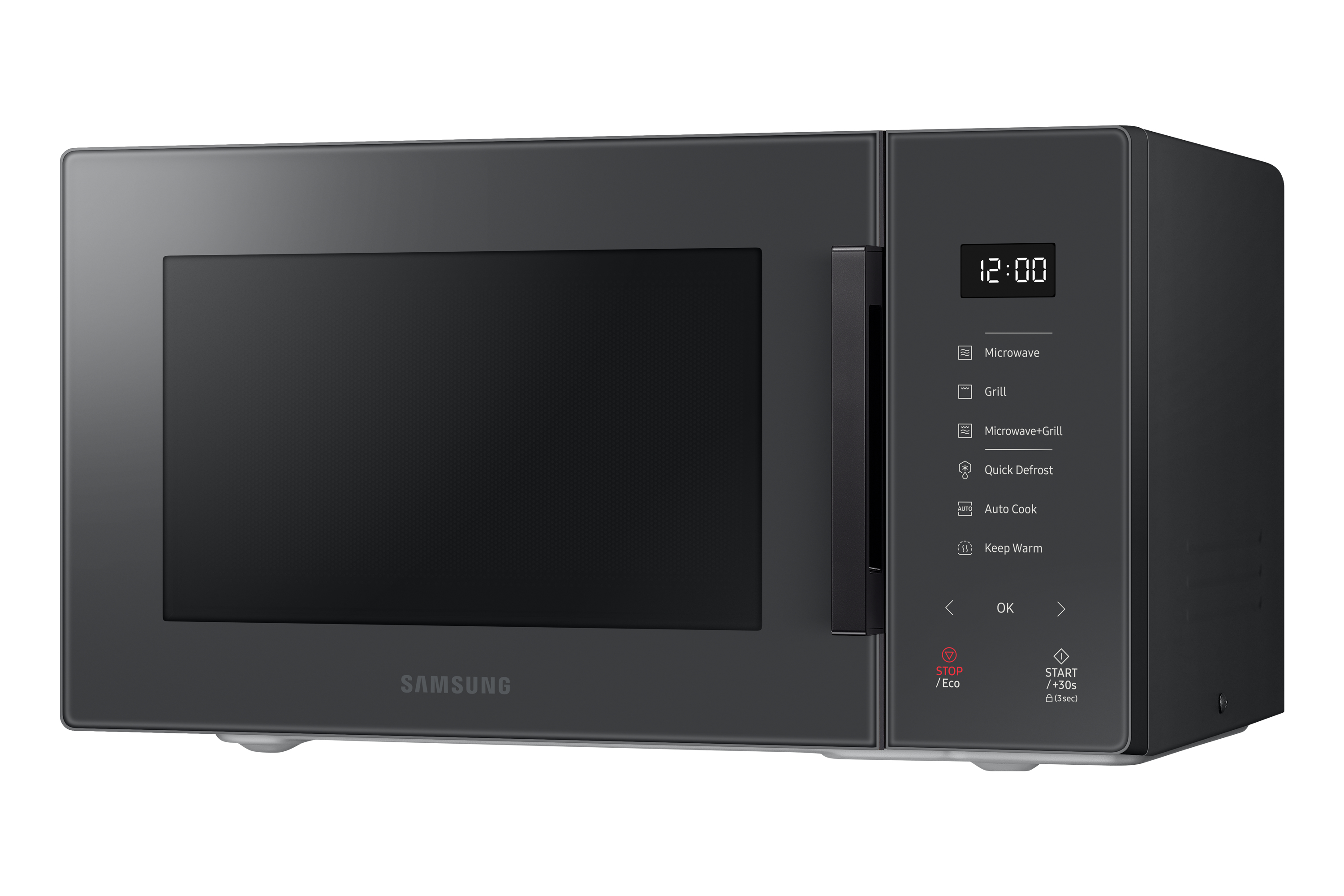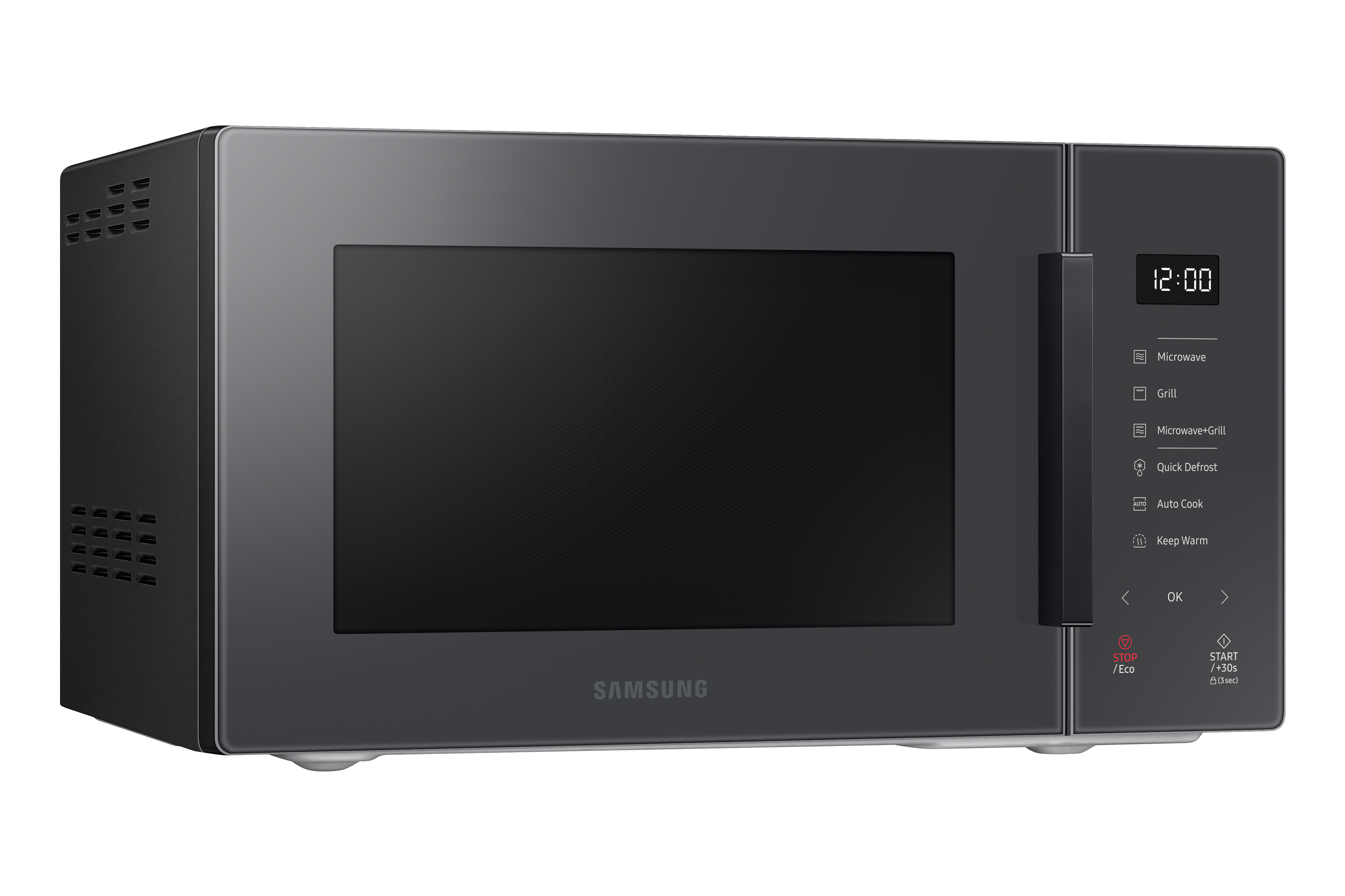 Samsung MG23T5018GC/ET. Emplacement de l'appareil : Comptoir, Type de produit : Micro-ondes combiné, Capacité intérieure : 23 L. Charge connectée : 1250 W, Tension d'entrée CA : 230 V, Fréquence d'entrée CA : 50 Hz. Largeur : 489 mm, Profondeur : 381 mm, Hauteur : 275 mm Le complément parfait à votre cuisineNouveau design et nouvelles couleursChoisissez le micro-ondes le plus adapté à vos goûts personnels et au style de votre cuisine. En plus d'un nouveau design, cette ligne est disponible dans une large gamme de couleurs : Charcoal, Graphite, Porcelain, Snow, Powder, Stone.Décongelation rapideDécongelez rapidement les aliments surgelés grâce à la fonction Quick Defrost, qui offre des options pour les 5 aliments les plus courants : viande, volaille, poisson, légumes et pain. Sélectionnez simplement le type d'aliment et le poids, et le four calcule automatiquement le temps de décongélation optimal. De cette façon, la préparation des ingrédients devient plus rapide, préservant ainsi les nutriments.Une touche de styleGlass Touch & Simple UXDécouvrez une façon intuitive et élégante de cuisiner. Le panneau de commande Glass Touch ne comporte que les 6 boutons essentiels, qui peuvent être actionnés d'une simple pression. De plus, étant en verre, il s'intègre parfaitement à la façade du four et à la porte, créant un look minimaliste élégant. Intérieur facile à nettoyer INTÉRIEUR EN CÉRAMIQUEà„¢ Le nettoyage après utilisation devient plus facile. La surface intérieure lisse CERAMIC INSIDEà„¢ peut être nettoyée sans frotter et ne se décolore pas avec le temps. L'institut de recherche allemand Hohenstein a reconnu que cette surface avait une efficacité antibactérienne de 99,9 %. C'est une surface robuste, 7 fois plus résistante aux rayures et à la rouille que les autres revêtements intérieurs. Améliorez vos résultats de cuisson Système de triple distribution Assurez-vous que tous vos plats sont délicieux et cuits à la perfection. Le système exclusif de triple distribution diffuse les micro-ondes dans 3 directions, de sorte qu'elles atteignent chaque point et traversent les aliments dans plusieurs directions. Cette fonction assure une cuisson beaucoup plus précise et uniforme.Cuisinez avec précisionCuisson automatiquePréparez de délicieux plats sans recettes et sans improviser. Auto Cook propose différentes options pour les plats fréquemment préparés, tels que les pâtes et la volaille. Chacune de ces options est préprogrammée avec le mode, le temps et la température optimaux. Pour une cuisson parfaite, sélectionnez simplement le type d'aliment et son poids. Économisez de l'énergie en mode veille ECO Préparez de délicieux plats sans négliger l'environnement. Le mode ECO réduit considérablement la consommation d'énergie en veille, la ramenant au niveau le plus bas du secteur. Lorsque vous ne cuisinez pas, le four maintient au minimum l'énergie nécessaire pour alimenter les fonctions essentielles. Ainsi, tout en économisant, vous contribuez à protéger l'environnement.