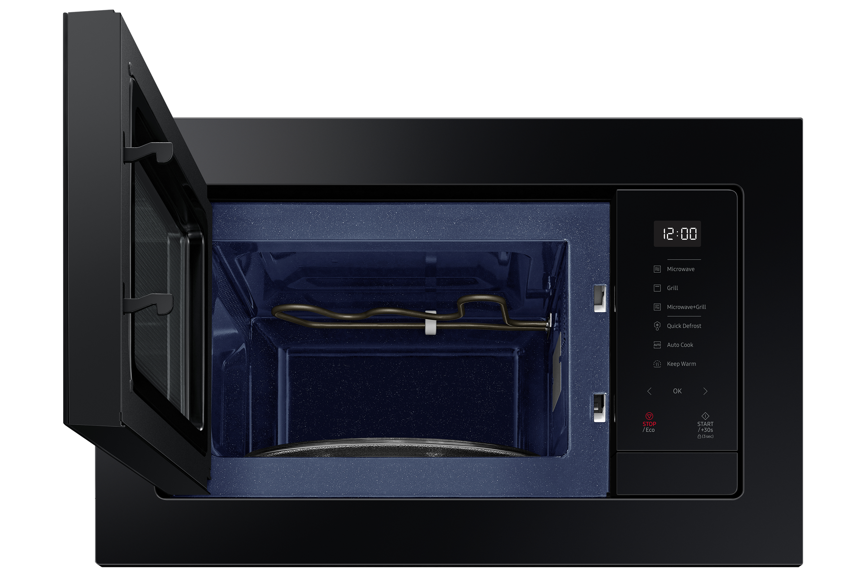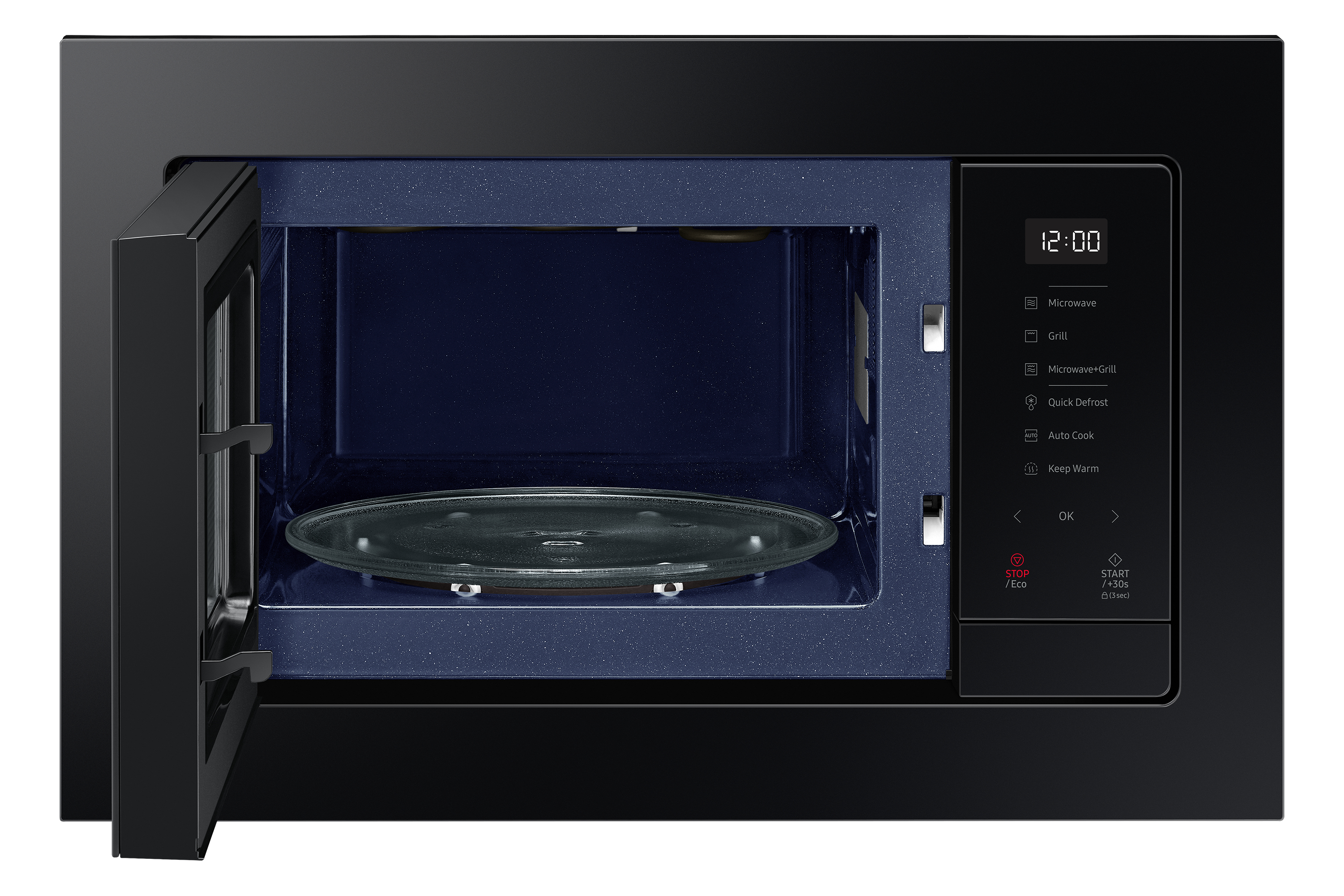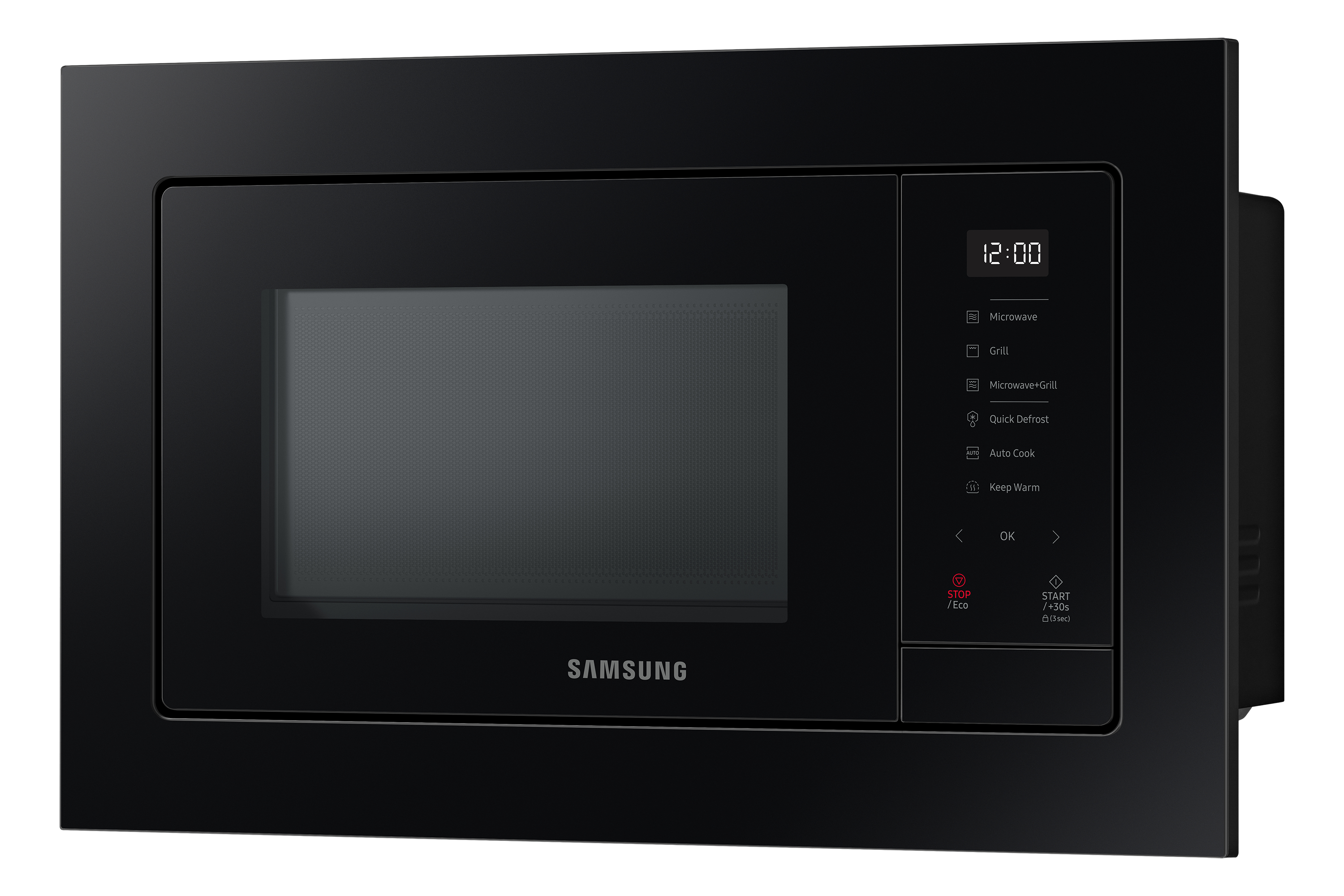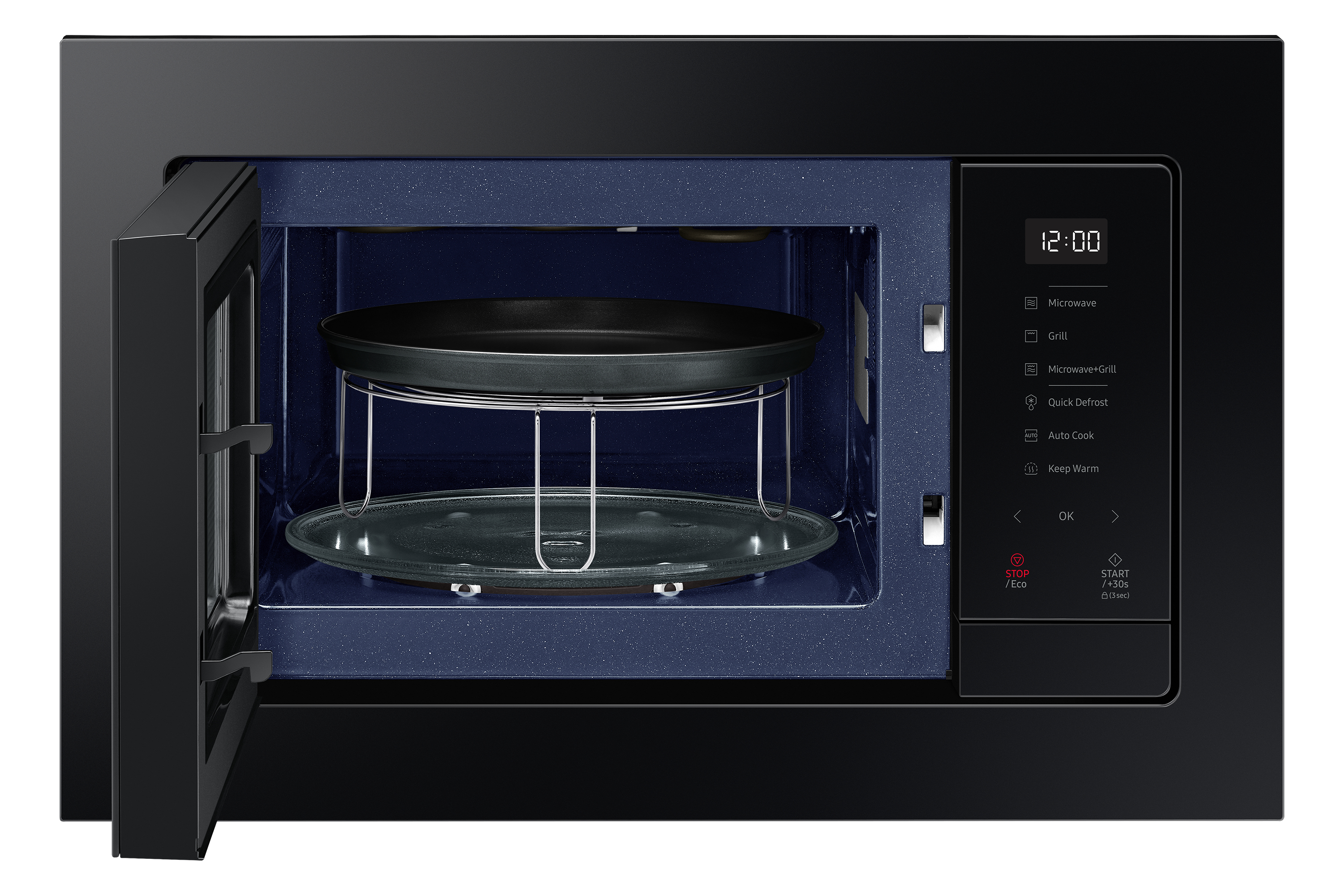 Four micro-ondes grill encastrable Samsung 23L MG23A7318CK. Emplacement de l'appareil: Encastrable, Type de produit: Micro-ondes avec grill, Capacité intérieure: 23 L. Charge connectée: 800 W, Tension d'entrée CA: 230 V, Fréquence d'entrée CA: 50 Hz. Largeur: 489 mm, Profondeur: 362 mm, Hauteur: 275 mmEn harmonie avec votre environnement de cuisineDesign intégré exclusif et polyvalentChoisissez un four à micro-ondes encastrable qui s'adapte parfaitement à vos goûts et au style de votre environnement de cuisine. Le design exclusif est complété par la porte en verre transparente et un élégant panneau de commande Glass Touch*, sans oublier les couleurs irrésistibles. Le choix vous appartient ! Des plats toujours délicieux et croustillantsGrill Fry (plaque de grattage)Des résultats toujours à la hauteur des attentes : des plats savoureux et croustillants, comme dans un four traditionnel. La fonction Grill Fry (avec plaque croustilleuse) cuit, dore et rôtit les aliments frais ou surgelés, comme les escalopes de poisson ou le poulet frais, tout en préservant leur saveur et leur texture. Et il n'utilise pas d'huile, pour une cuisine plus saine. Du pain frais tous les jours Décongélation du pain Décongelez votre pain rapidement et facilement. D'une simple pression sur un bouton, la fonction Décongélation du pain calcule le temps et la température optimaux pour décongeler le pain, les petits pains et les croissants. Et pour que votre pain soit toujours cuit et bien doré, vous pouvez utiliser les fonctions Fourreau Réchauffeur et Plat Crousti-Fruitier. Vos desserts, sans soucis Dessert Maison Profitez de toute la douceur d'un dessert maison sans perdre de temps à préchauffer le four. Mélangez les ingrédients et sélectionnez l'option Dessert Maison. Une seule touche suffit pour créer le dessert parfait pour chaque occasion. Décongélation rapide Décongélation rapide Décongelez rapidement les aliments surgelés grâce à la fonction Décongélation rapide, qui propose des options pour les 5 aliments les plus courants : viande, volaille, poisson, légumes et pain. Sélectionnez simplement le type d'aliment et le poids, et le four calcule automatiquement le temps de décongélation optimal. De cette façon, la préparation des ingrédients devient plus rapide, préservant les nutriments. Améliorez vos résultats en cuisine Système de triple distribution Assurez-vous que tous vos plats sont délicieux et cuits à la perfection. Le système exclusif de triple distribution diffuse les micro-ondes dans 3 directions, de sorte qu'elles atteignent chaque point et traversent les aliments dans plusieurs directions. Cette fonction assure une cuisson beaucoup plus complète et uniforme. Intérieur facile à nettoyer INTÉRIEUR EN CÉRAMIQUEà„¢Le nettoyage après utilisation devient plus facile. La surface intérieure lisse CERAMIC INSIDEà„¢ peut être nettoyée sans frotter et ne se décolore pas avec le temps. L'institut de recherche allemand Hohenstein a reconnu que cette surface avait une efficacité antibactérienne de 99,9 %. C'est une surface robuste, 7 fois plus résistante aux rayures et à la rouille que les autres revêtements intérieurs.