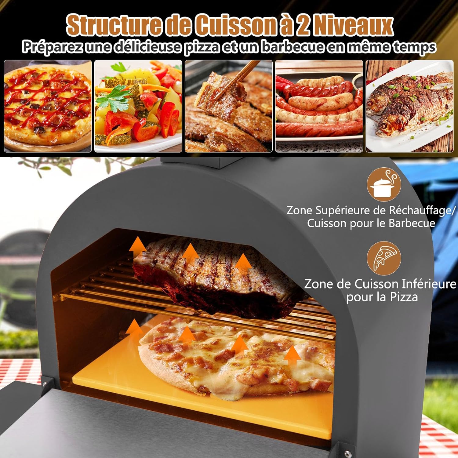 - Structure de Cuisson à 2 Niveaux : Ce four à pizza à 2 niveaux comprend une pierre à pizza et une grille de cuisson, vous permettant de cuire votre pizza au niveau inférieur tout en grillant des barbecues succulents dans la zone supérieure. Ce design innovant maximise l'espace, offrant des options de cuisson et de maintien au chaud simultanées pour un repas copieux.