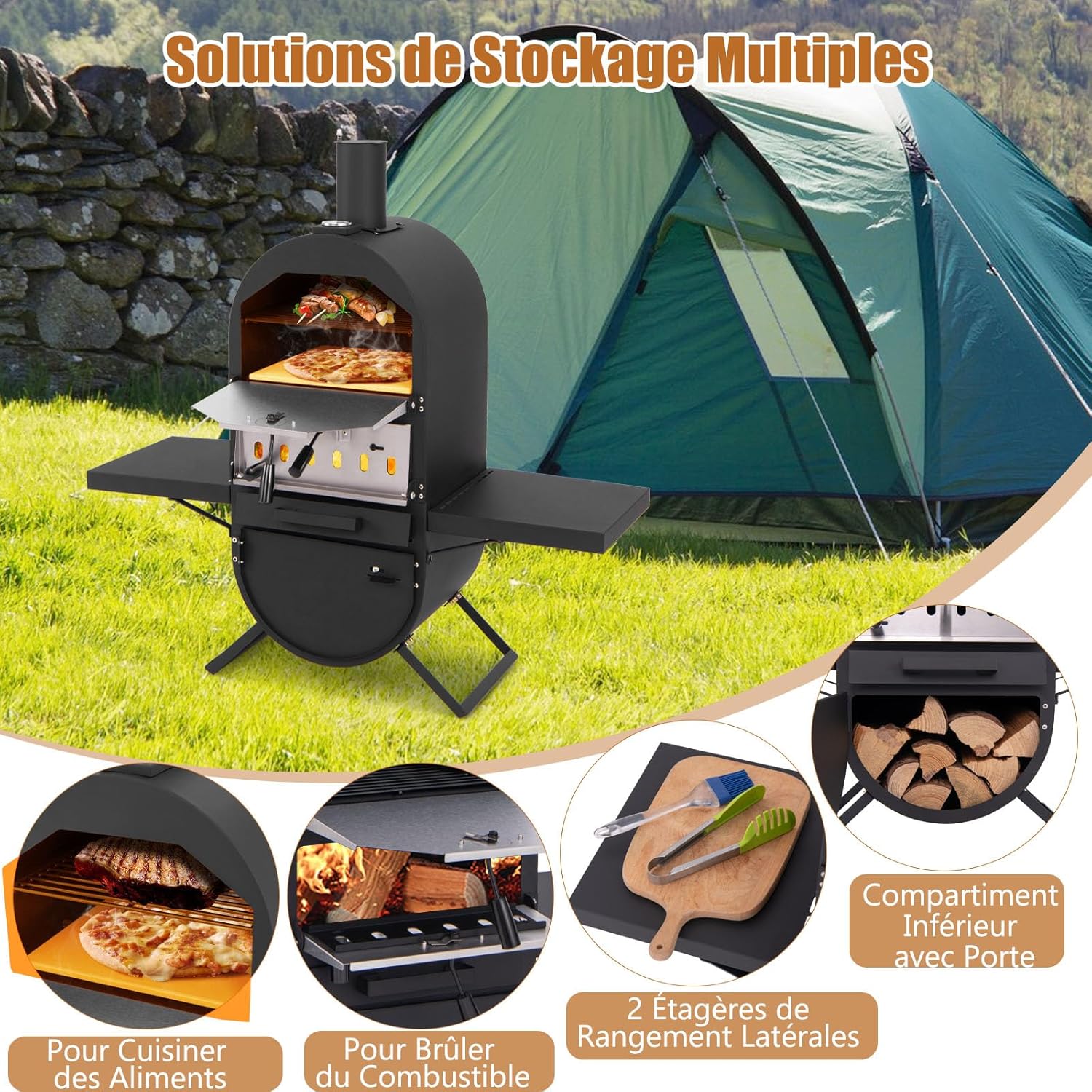 - Multiples Solutions de Rangement : Le four à pizza autoportant offre un vaste espace de rangement. La partie supérieure comprend un compartiment pour la cuisson des aliments et un compartiment pour brûler le combustible, tandis que la partie inférieure peut stocker du bois. De plus, il y a 2 étagères latérales pour garder les essentiels de cuisine à portée de main.