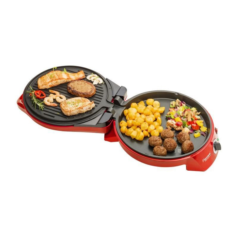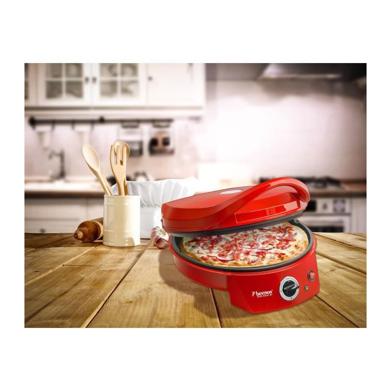 apz400 - four à pizza et grill-viandes 2en1 1800w 27cm rouge - Four à pizza BESTRON APZ400, pour la préparation de délicieux pizzas frais et congelés (Ø 27cm) dans 10 minutes environ. Aussi pour tartes flambées, quiches et réchauffement des plates.Entièrement ouvert, une surface grill généreuse s?établie. Idéal pour griller et réchauffer en même temps. Plaque de cuisson avec revêtement antiadhésif et facile à nettoyer. Poignée résistant à la chaleur. Échauffement rapide (7 Minutes / 180°). 2 éléments chauffants reflétés pour la chaleur supérieure et inférieure permettent. Température réglable en progressif avec lampe témoin prêt à l?emploi. Interrupteur marche/arrêt avec lampe témoin. Pieds antidérapants alors très stable. De nombreuses recettes incluses.