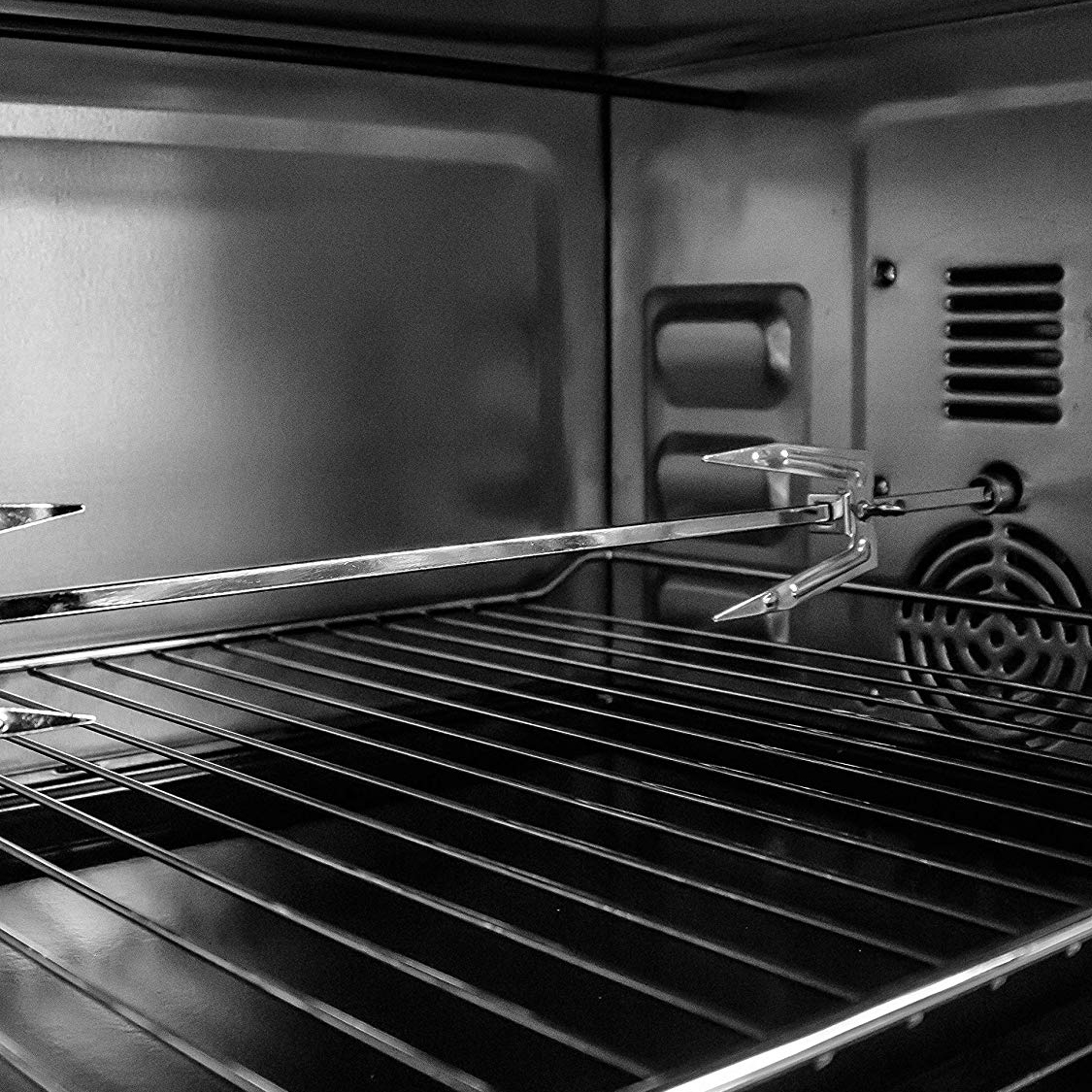 Four de table à convection en acier inoxydable ; comprend une brochette rotative pour rôtir les poulets et 2 plateaux pour préparer des pizzas, des pommes de terre au four, des toasts ou des pâtisseries incroyables.Grâce à son système de circulation d'air, qui entoure les aliments et permet d'obtenir des résultats tendres et savoureux, vous pouvez cuisiner sans huile, avec moins de graisses saturées ; vous obtenez des repas plus sains que la friture ou le sauté.Porte en verre très résistante qui aide à maintenir la température ; minuterie jusqu'à 60 minutes ; température réglable jusqu'à 230ºc ; témoin lumineux de fonctionnement et base antidérapante.Le bouton de fonction vous permet de choisir si vous voulez qu'il chauffe uniquement par le haut ou par le bas, ou les deux en même temps.Comprend une plaque de cuisson, un grill, une poignée avec clip pour retirer les accessoires et une brochette de poulet tournante. Son extérieur laqué le rend facile à nettoyer.