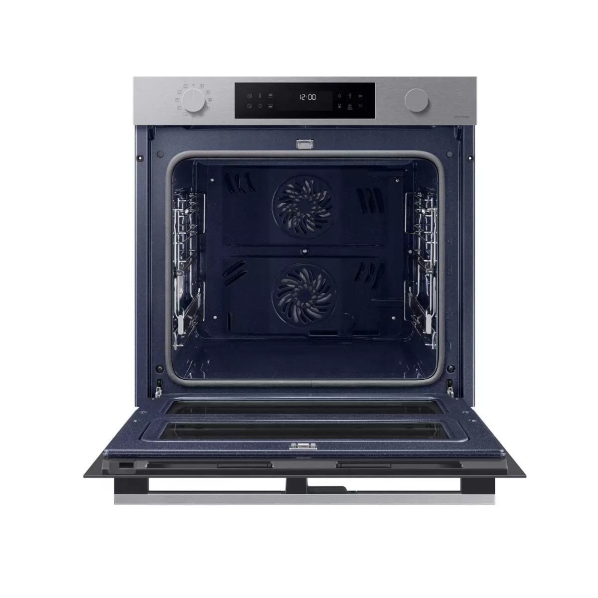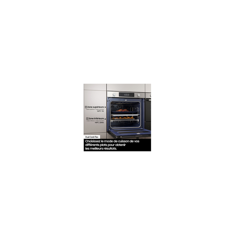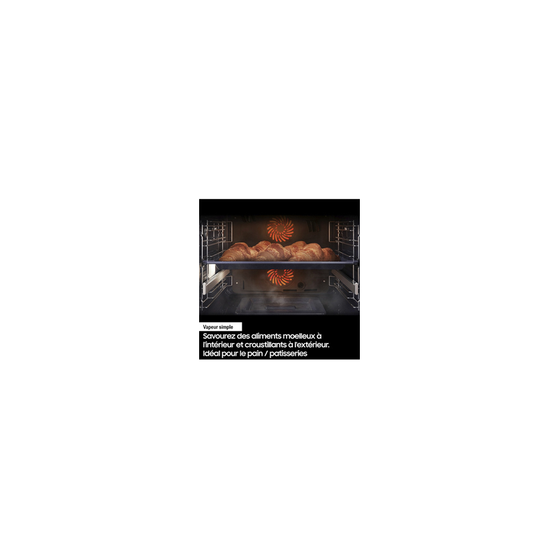 NV7B4550VAS - Four Intégrable Multifonction 76l 60cm Pyrolyse Inox - En mode Twin Convection, ce four pyrolyse Samsung NV7B4550VAS doté d’un système d’ouverture à deux portes vous offre la possibilité de suivre la cuisson de la cavité supérieure sans altérer la cuisson de la cavité inférieure (pas de perte de chaleur). Cette technologie est idéale pour la cuisson des pains et m pâtisseries nécessitant une température stable et précise. Savourez des plats croustillants à l’extérieur et moelleux à l’intérieur grâce à la vapeur simple. Il suffit de verser de l'eau sur le plateau inférieur, sélectionner le mode associé sur le four et la vapeur générée va faire le reste pour des résultats ultra gourmands. Le système sous-vide combine technologie de contrôle de température statique et doubles capteur de température dans toute la cavité. Il garantit que tout est parfaitement cuit, avec un goût délicieusement tendre et juteux. Il vous suffit de dire ce que vous voulez que le four fasse pour qu’il le fasse. Vous pouvez l’allumer ou l’éteindre, sélectionner des fonctions et modifier des paramètres, même si vous êtes occupé à faire autre chose. Surveillez et contrôlez le four à tout moment, où que vous soyez, à l'aide de l’application SmartThings. Vous pouvez préchauffer le four ou l'éteindre. Vous pouvez également vérifier et régler la température et la durée de cuisson ou sélectionner rapidement des réglages préprogrammés.
