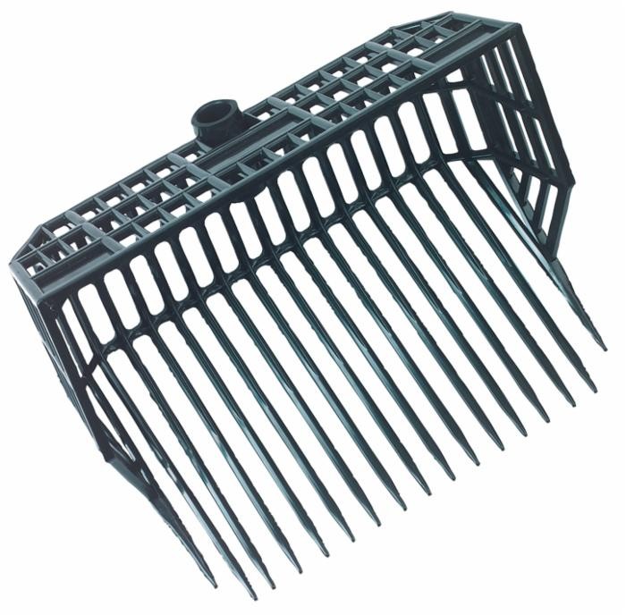 Fourche à copeaux en plastique robuste Fourche à copeaux, profonde et compacte Curage plus rapide qu'avec une fourche plate grâce à un volume plus important En plastique presque incassable Avec 17 dents hautement élastiques et renforcées à l'arrière Dimensions de la fourche : env. 38 x 30 cm Livré sans le manche