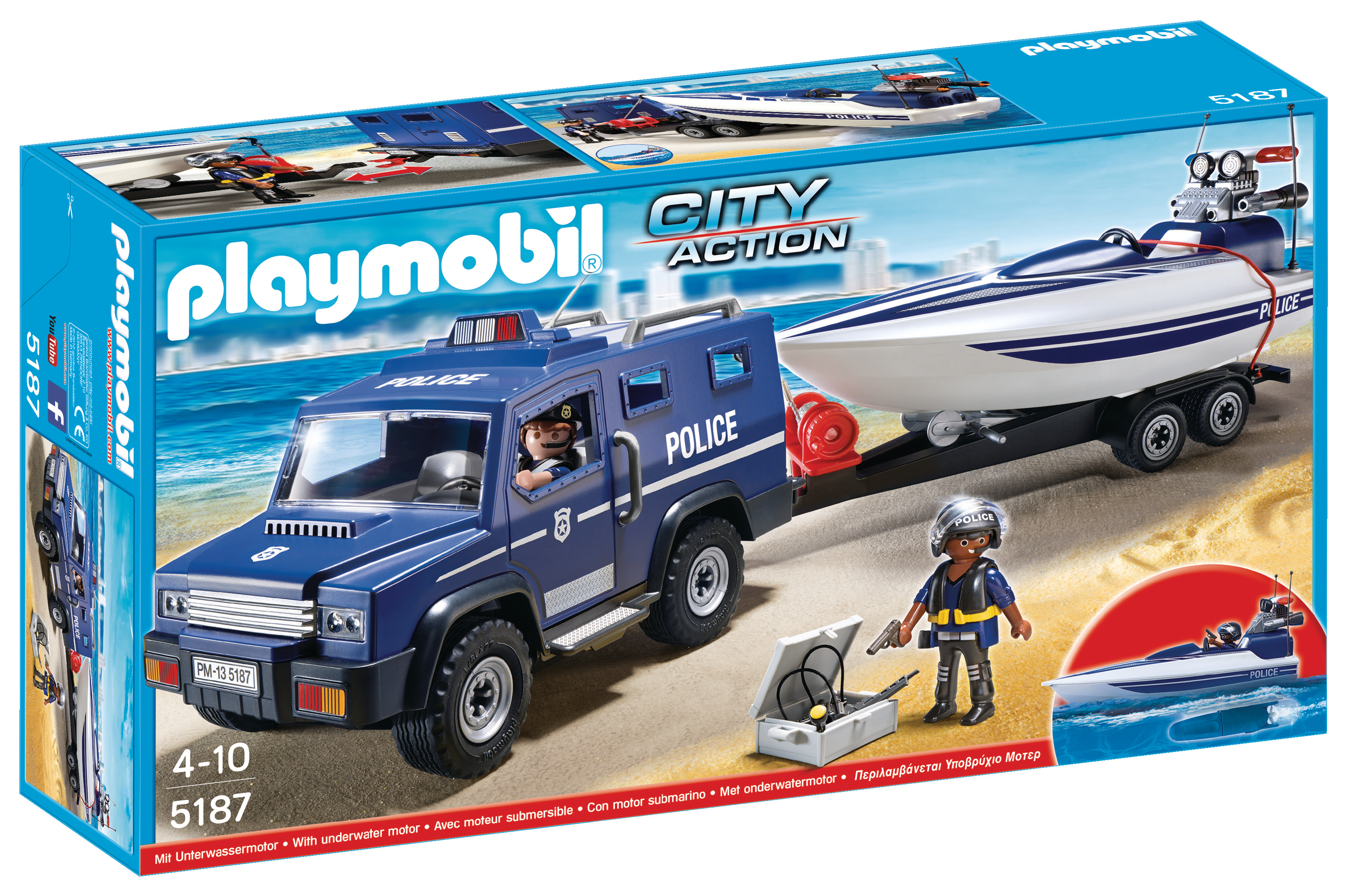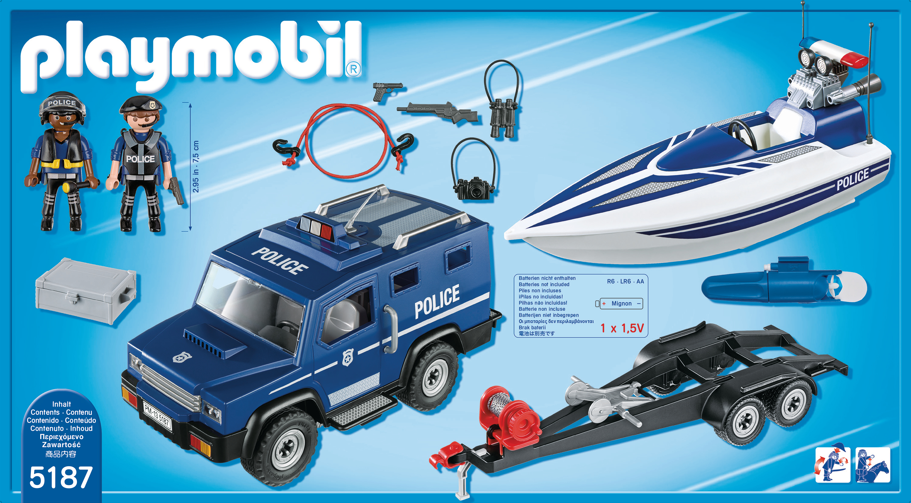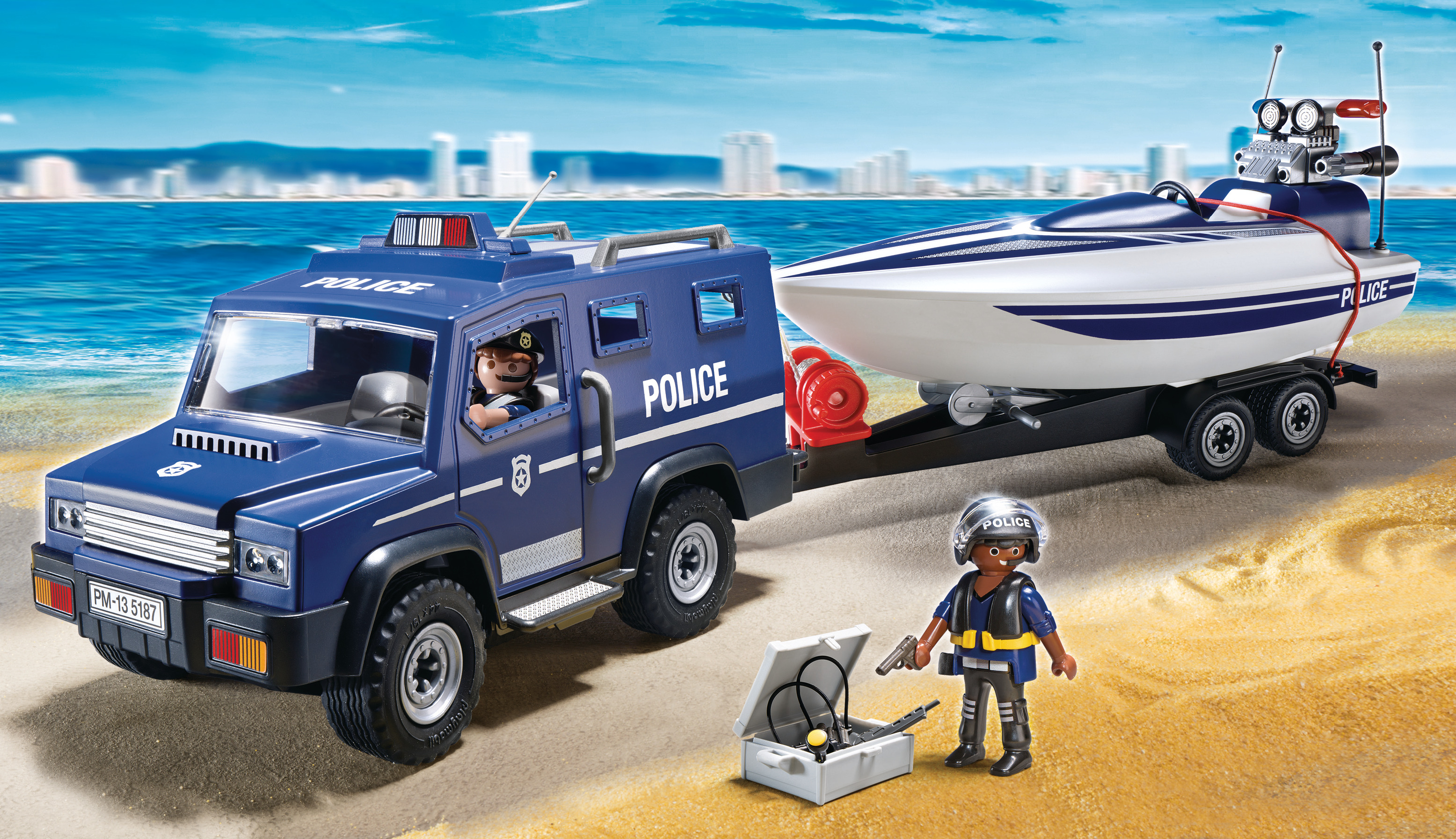 Fourgon avec 2 policiers, une vedette et des accessoires.