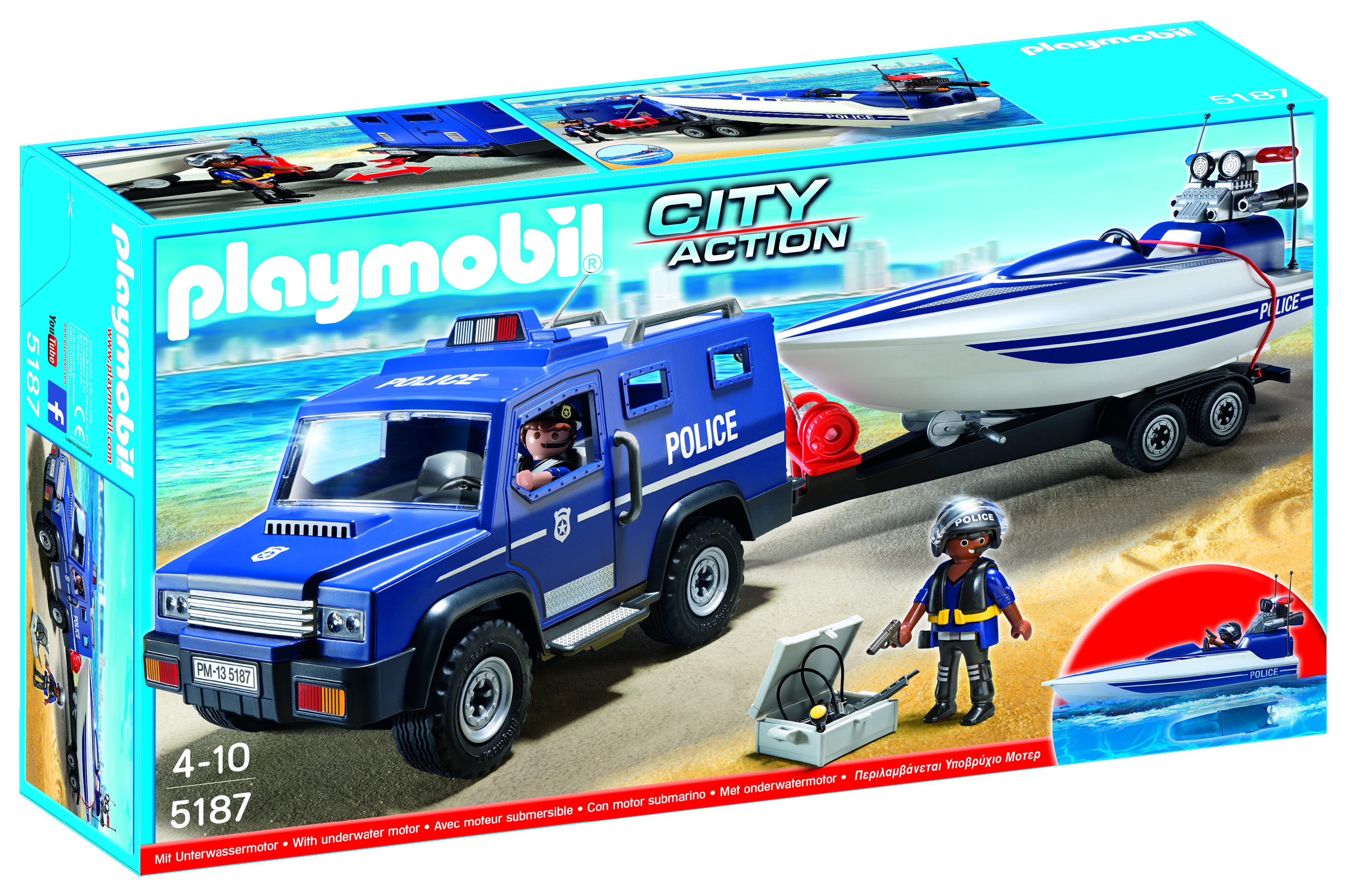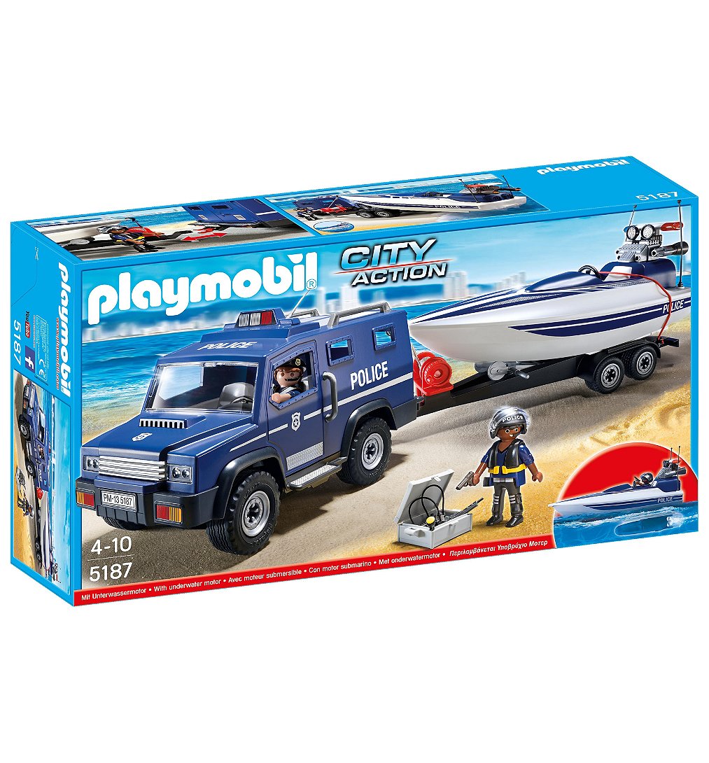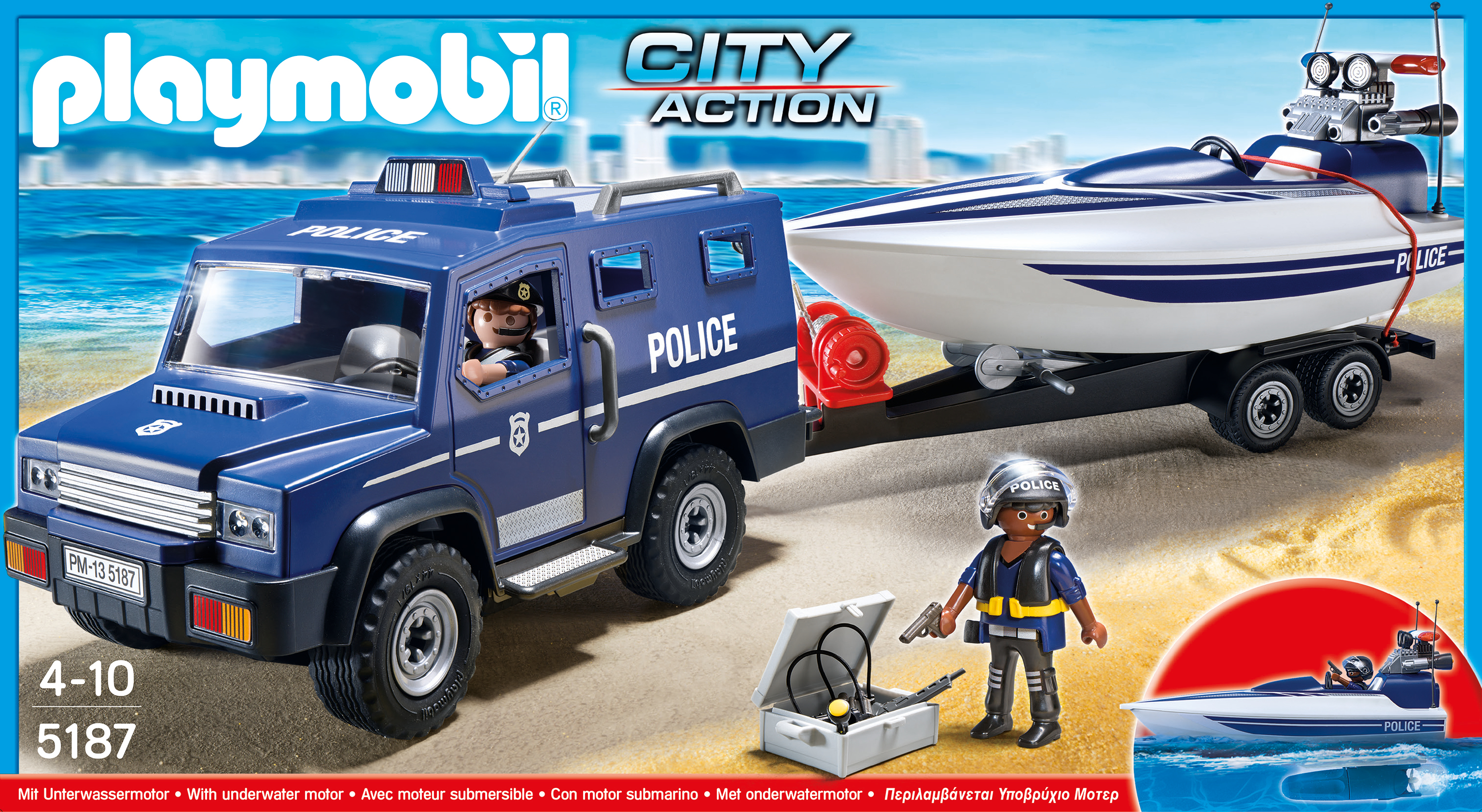 Fourgon avec 2 policiers, une vedette et des accessoires.