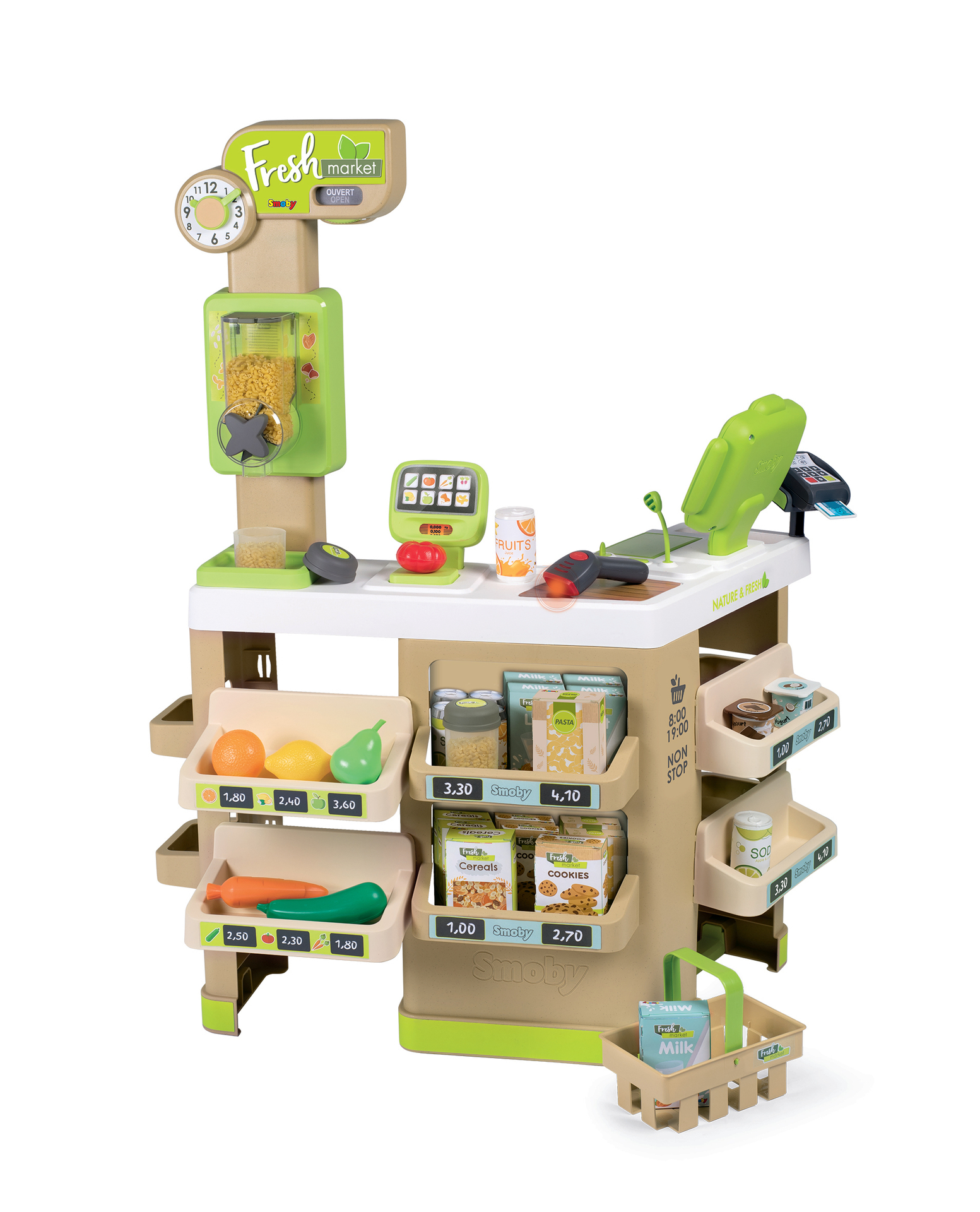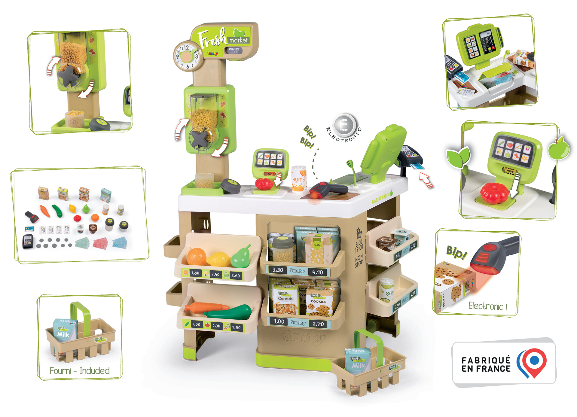 | Plus produit | Marchande avec plusieurs fonctions de jeu: vrai distributeur de nourriture en vrac, caisse enregistreuse, lecteur de code-barres électronique, balance mécanique... 43 acc + panier. |