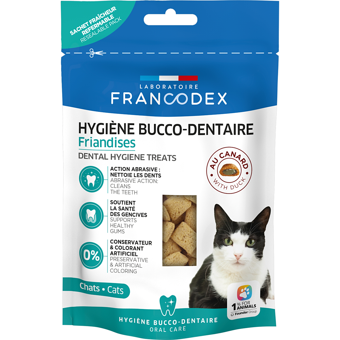 Les FRIANDISES BUCCO-DENTAIRES FRANCODEX permettent d’éliminer les débris alimentaires et de limiter l’accumulation du tartre grâce à l’action abrasive de leur enveloppe de céréales. Elles contiennent des huiles de graines de persil et de menthe poivrée, pour lutter efficacement contre la mauvaise haleine de votre chat. Enfin, la vitamine C contribue à maintenir des gencives saines. Il est indispensable d’assurer une hygiène régulière des dents de votre chat dès son plus jeune âge afin de prévenir l’apparition du tartre et limiter les problèmes bucco-dentaires.