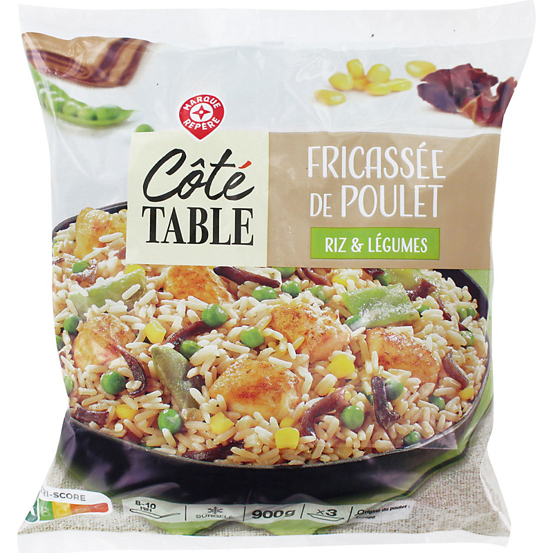 Ingrédients : Riz cuit 45,4 % (eau, riz), émincés de cuisse de poulet traité en salaison 15 % (viande de cuisse de poulet, amidons, dextrose, sel), petits pois 11,1 %, haricot plat 7 %, oignon 4 %, champignon noir 3,2 %, maïs doux en grains 3,2 %, sauce soja (eau, graine de soja, blé complet, sel, vinaigre d'alcool, alcool, sucre), oignon préfrit 3 % (oignon, huile de tournesol), huile de colza, champignon en poudre 0,5 % (champignon en poudre, maltodextrine de maïs), oignon en poudre, sucre, bouillon de légumes (sel, poudre de légumes (oignon, carotte, tomate), huile de tournesol, livèche, poivre blanc), citronnelle, amidon de riz, poudre d'ail, feuille de coriandre, poudre de gingembre, poivre blanc.