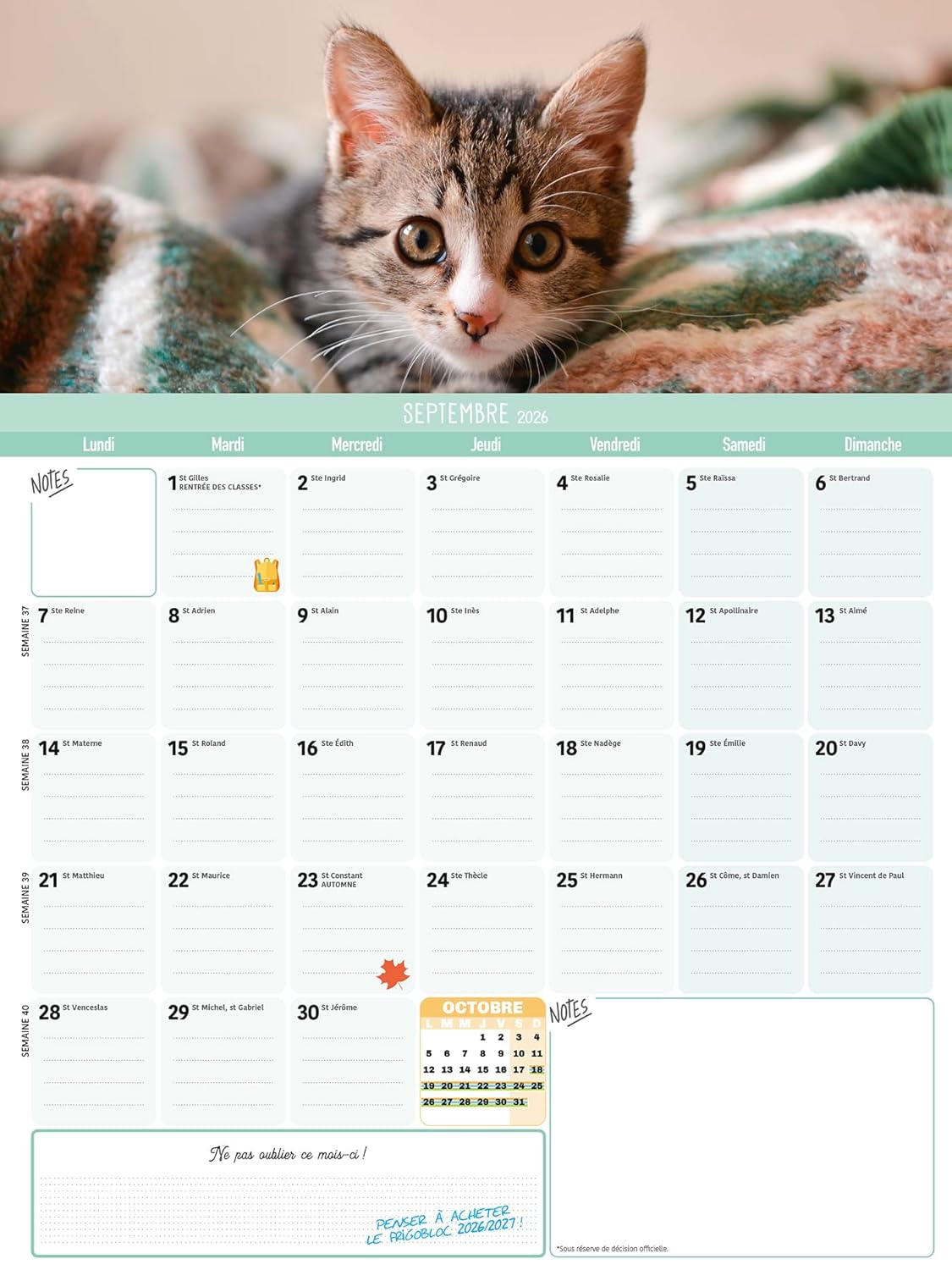 Planifiez tout sur 16 mois, de septembre 2025 à décembre 2026 avec ce calendrier maxi-aimanté spécial Chats. Le planning d'organisation mensuel permet de tout noter et de ne rien rater de la vie familiale et retrouvez chaque mois également une belle et grande photo de vos chats préférés (photos 100% nouvelles).