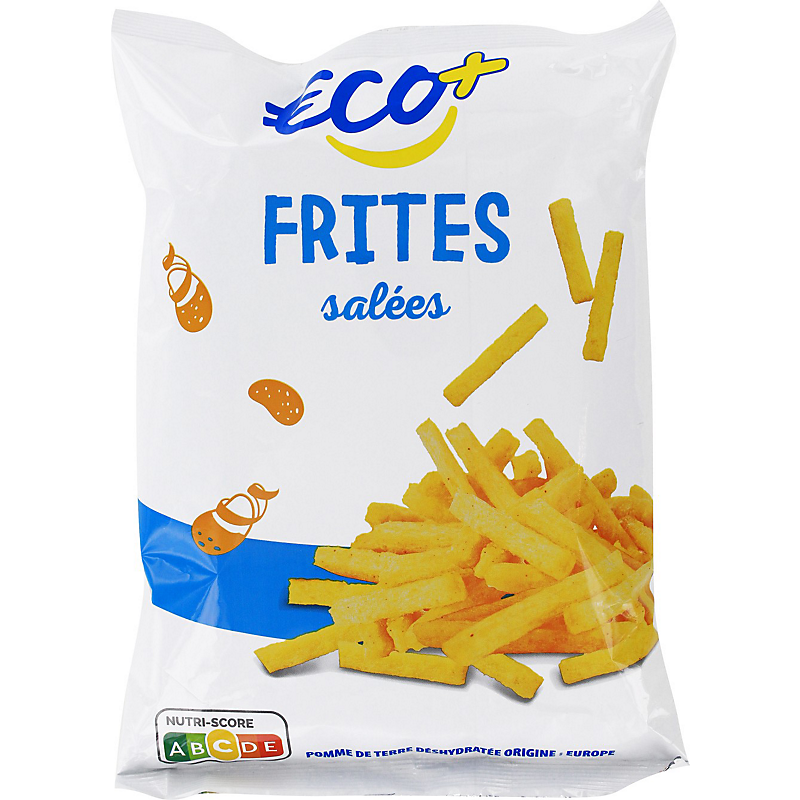 Produits soufflés à base de pomme de terre déshydratée et de semoule de maïs, salés ECO +