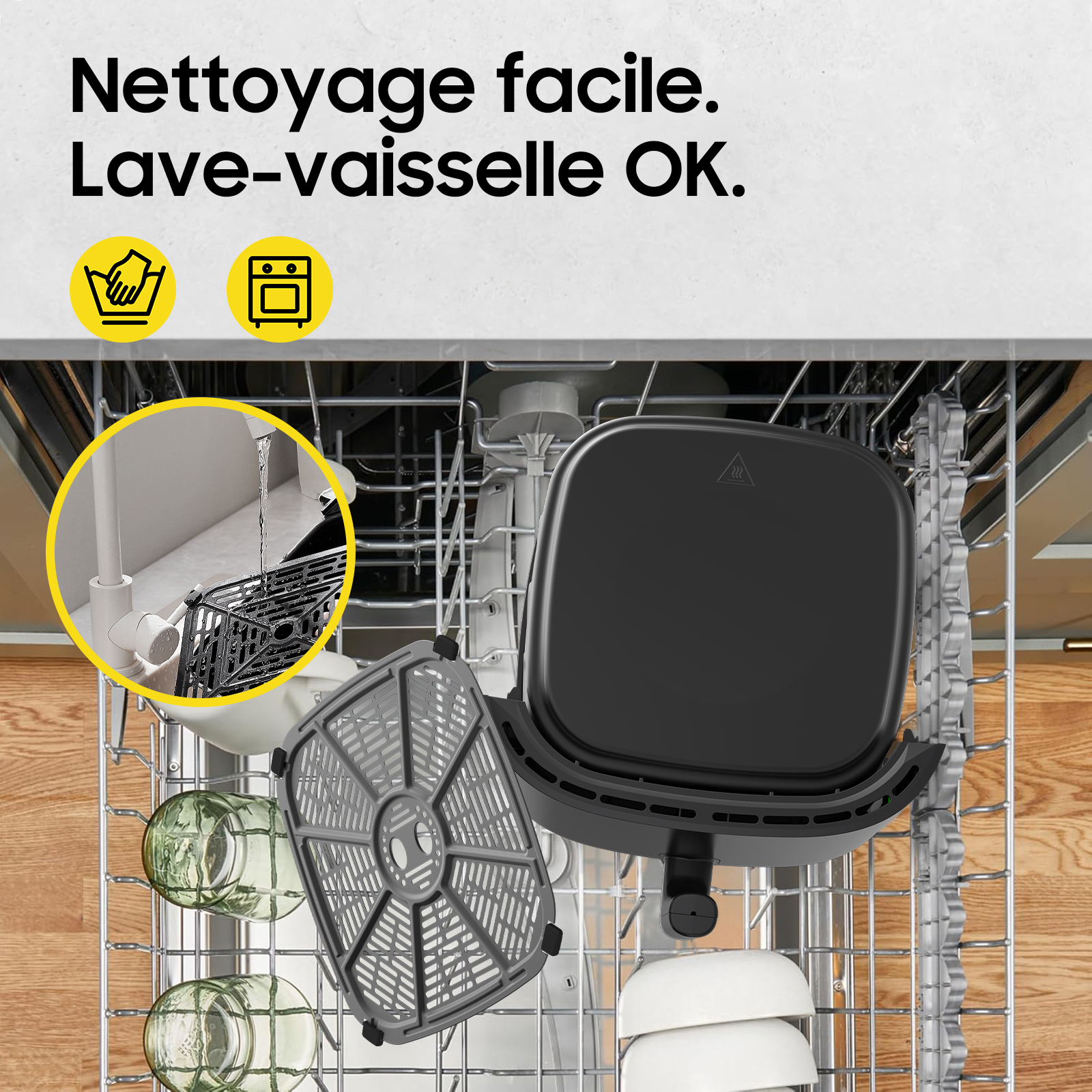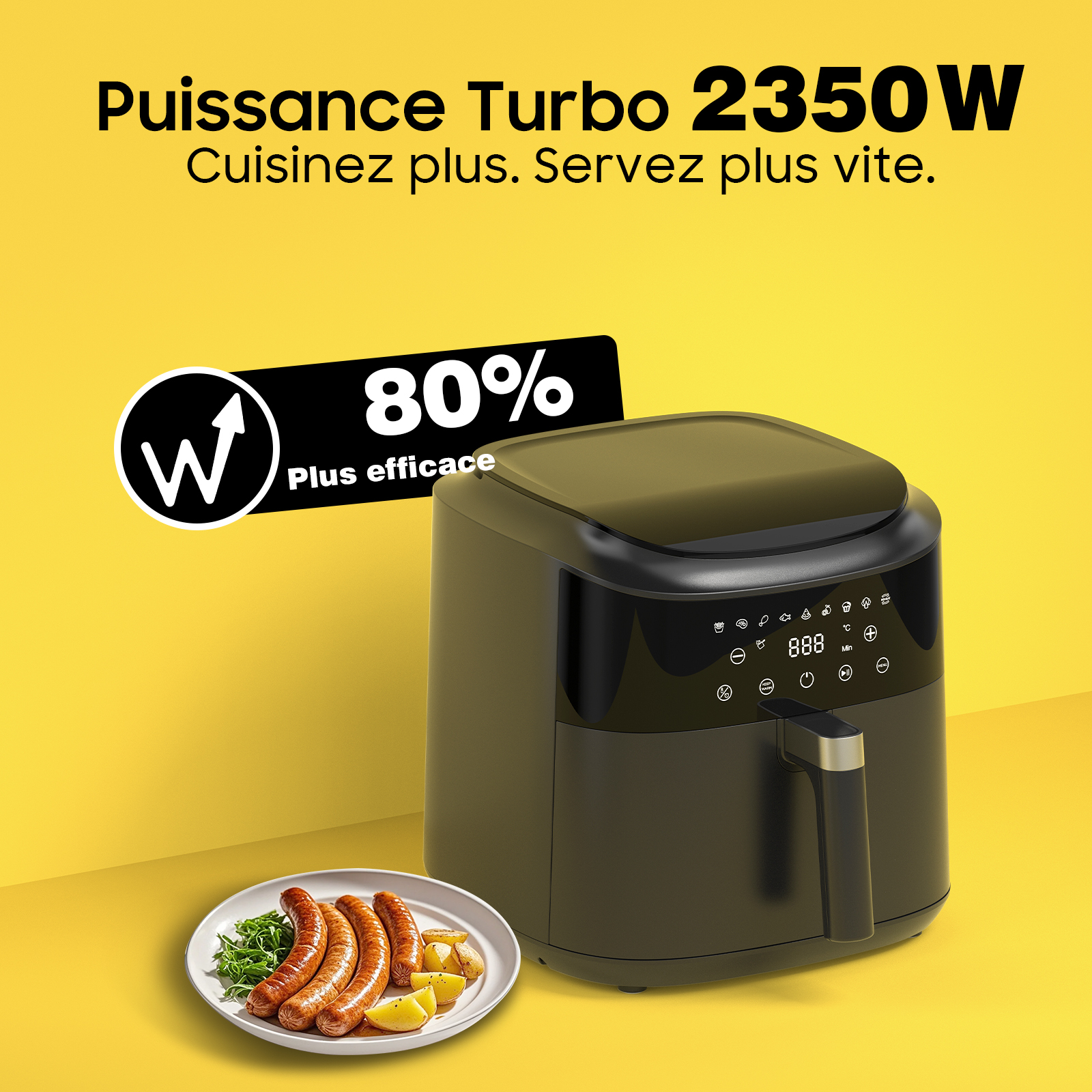 Assistant de cuisine complet – Redéfinit la cuisson saine La friteuse à air intelligente AF80D10-1 vous offre une expérience culinaire révolutionnaire. Grâce à sa technologie de circulation d'air chaud à 360°, vous préparez des plats dorés et croustillants sans utiliser beaucoup d'huile. Sa grande capacité de 9 litres répond facilement aux besoins d’un foyer de 3 à 5 personnes – pour le quotidien comme pour les moments entre amis. 9 programmes intelligents – Cuisson facile en un seul bouton Nous avons conçu pour vous 9 programmes préréglés : frites, steak, cuisses de poulet, poisson, pizza, déshydratation, gâteau, légumes et réchauffage. Que vous soyez débutant ou chef expérimenté, une simple pression suffit pour vivre une expérience de cuisine professionnelle. Chaque programme est scientifiquement calibré pour une cuisson parfaite à la température et au temps optimaux. Performances puissantes et efficaces Équipé d’un système de chauffage haute puissance de 2350 W et d’une technologie de circulation d’air chaud à 360°, la chaleur se répartit uniformément. Les parois intérieures en métal sont durables et faciles à nettoyer, tout en retenant efficacement la chaleur pour une meilleure efficacité énergétique – vos aliments atteignent ainsi le résultat idéal plus rapidement. Design ergonomique avec rappels intelligents Écran tactile LED clair et intuitif, interface conviviale. La fonction unique de « rappel de secouage » vous alerte intelligemment à mi-cuisson pour remuer les aliments, garantissant une cuisson uniforme et un goût optimal. Réglages flexibles de température et de temps pour répondre à vos besoins culinaires personnalisés. Cuisson saine avec peu d’huile et nettoyage facile Comparée à la friture traditionnelle, notre friteuse à air réduit jusqu’à 85 % l’utilisation d’huile – pour un mode de vie plus sain pour vous et votre famille. Toutes les pièces amovibles sont faciles à nettoyer, et le revêtement antiadhésif empêche les résidus de graisse, pour un entretien rapide et sans effort. Sécurité et qualité garanties Le produit respecte des normes de sécurité internationales strictes et dispose de plusieurs protections, notamment contre la surchauffe et la cuisson à sec. Les matériaux écologiques ne libèrent aucune substance nocive – pour une utilisation en toute sérénité. Que vous prépariez des encas sains pour les enfants ou un dîner familial copieux, cette friteuse à air sera votre partenaire de confiance en cuisine. Caractéristiques techniques : Modèle : AF80D10-1 Tension nominale : AC 220-240 V Fréquence : 50/60 Hz Puissance : 1950-2350 W Poids : 4,84 kg Plage de température : 40 °C – 200 °C Plage de temps : max. 60 minutes (mode déshydratation : 1–15 heures) Température d’utilisation ambiante : -20 °C à 50 °C Contenu de l’emballage : 1 × Friteuse à air (appareil principal) 1 × Manuel d’utilisation 1 × Panier de friture 1 × Casserole (récipient) 1. 9 programmes intelligents préréglés Conçus spécialement pour les ingrédients courants : frites, steak, cuisses de poulet, poisson, pizza, déshydratation, gâteau, légumes et réchauffage. Commande en un seul bouton – même pour les débutants. 2. 2350 W haute puissance + circulation d’air chaud à 360° Système de chauffage puissant pour une distribution rapide et uniforme de la chaleur. Parois intérieures en métal renforçant l’efficacité thermique, réduisant le temps de cuisson et gardant les aliments juteux. 3. Grande capacité de 9 litres XXL Espace généreux pour un poulet entier ou plusieurs portions de frites – idéal pour les familles de 3 à 5 personnes. Répartition uniforme sans chevauchement pour des résultats optimaux. 4. Fonctions intelligentes et ergonomiques Grand écran tactile LED pour une utilisation intuitive. « Rappel de secouage » pour un retournement uniforme. Température réglable de 40 à 200 °C, durée jusqu’à 60 min (déshydratation jusqu’à 15 h) pour une grande flexibilité. 5. Sain, peu d’huile + nettoyage facile La technologie à air chaud réduit jusqu’à 85 % l’utilisation d’huile. Pièces amovibles antiadhésives – nettoyage rapide au chiffon (ou au lave-vaisselle si compatible). Gain de temps pour profiter pleinement de vos repas.