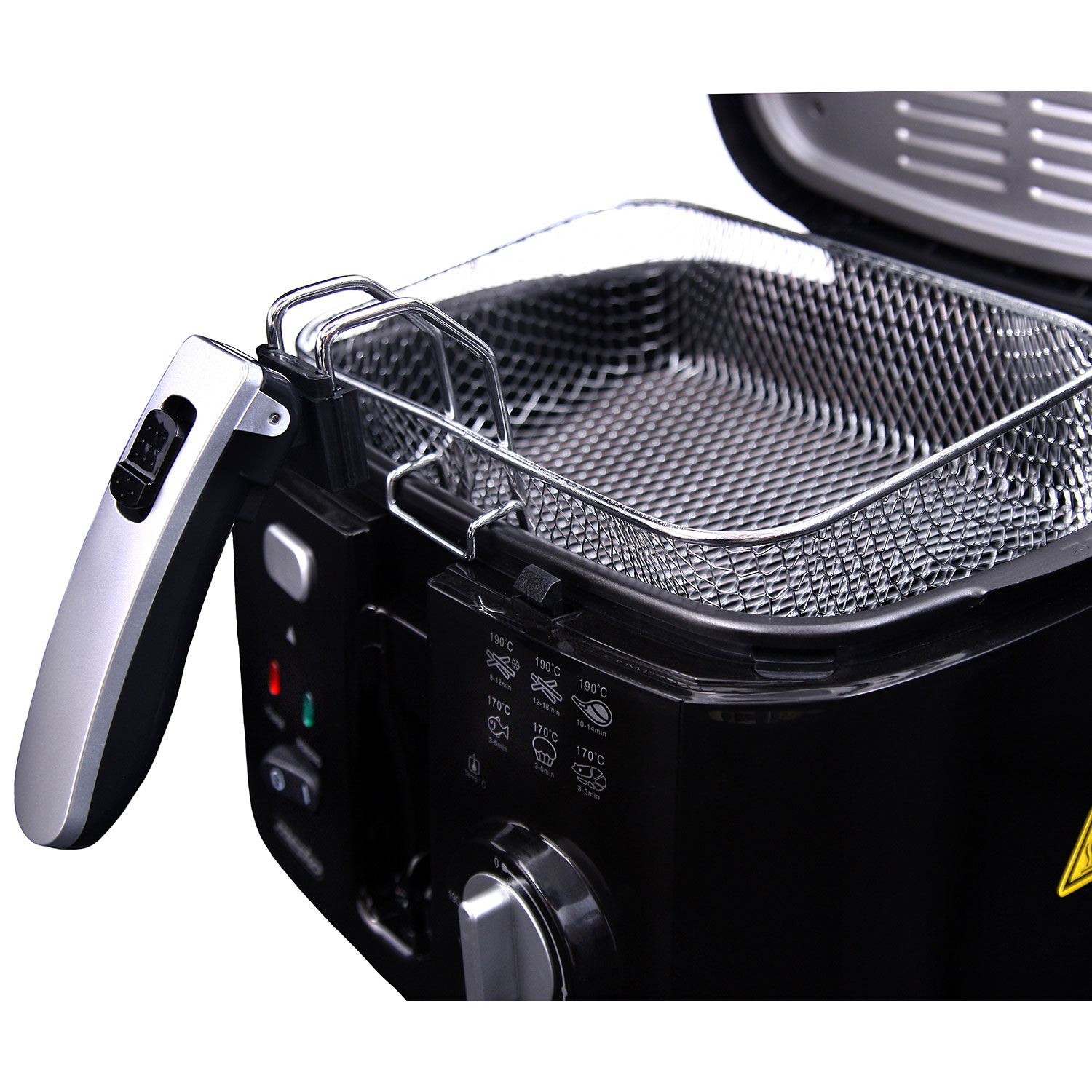- Fonctionnalité et confort : Le panier avec fonction de levage pour égoutter l'excès d'huile et la poignée pliable facilitent la manipulation, tandis que la cuve à huile amovible et antiadhésive rend le nettoyage rapide et simple.