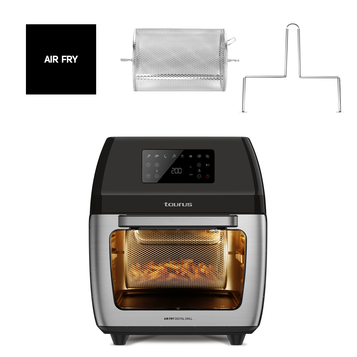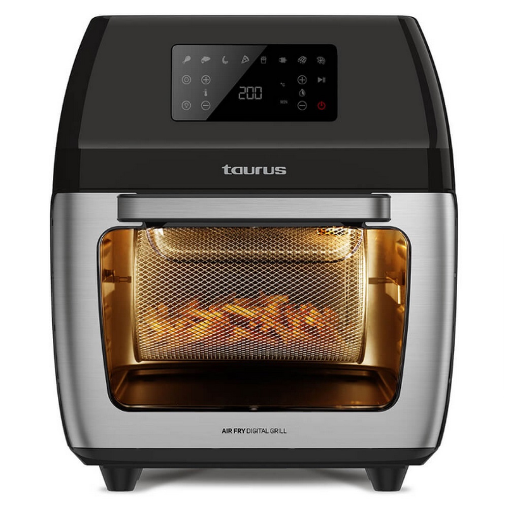 973981000 - friteuse/four sans huile 12l 1700w noir - La friteuse numérique Air Fry Digital Grill Taurus 973981000 est tout ce dont vous avez besoin pour cuisiner plus sainement. Grâce à son écran tactile numérique, cette friteuse est facile à utiliser. Il vous permet de régler le temps entre 0 et 60 minutes et la température entre 40 et 200 degrés Celsius. La puissance de 1300 W de la friteuse assure une cuisson rapide et homogène, tandis que le signal sonore en fin de cuisson vous avertit que les aliments sont prêts.