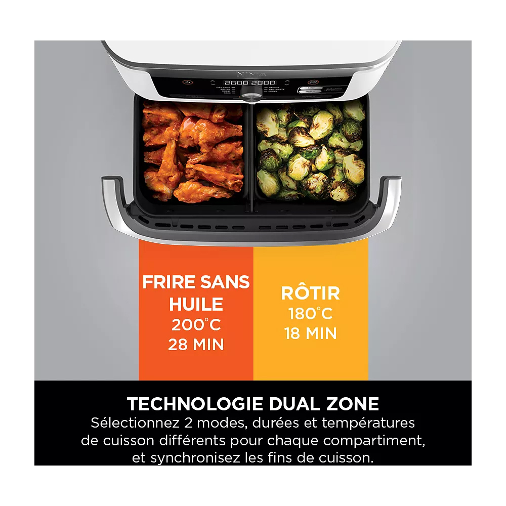 La technologie DualZone de Ninja permet d'utiliser différents modes de cuisson, durées et températures dans chaque tiroir, puis de synchroniser les fins de cuisson !