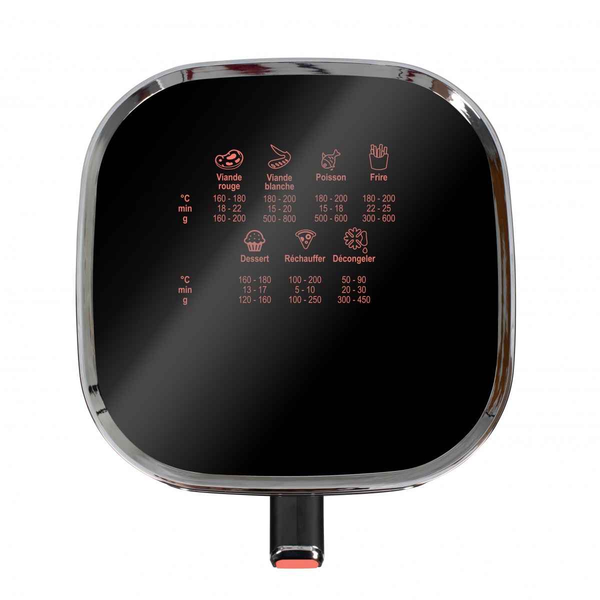 6 programmes de cuisson pour cuire sainement tous les aliments : steak, ailes de volaille, poisson, frite, dessert, pizza puissance 1450 watt température réglable de 80 à 200 °C par palier de 5 °C temps de cuisson réglable de 1 à 60 minutes par palier d’une minute panneau de commande tactile air chaud circulant à 360° avertisseur sonore de fin de cuisson bac avec revêtement antiadhésif accessoires inclus : 1 grille compatible lave-vaisselle protection contre la surchauffe 4 pieds antidérapants