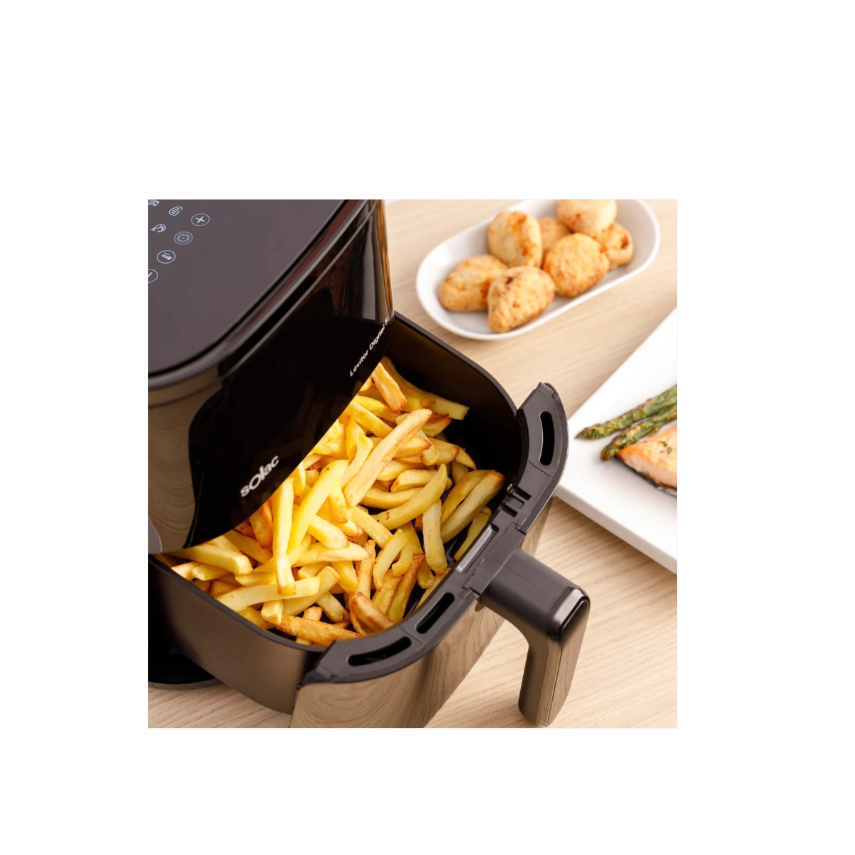La friteuse Solac Léviter Digital 5 est une friteuse sans huile d'une capacité totale de 5 litres, suffisante pour préparer jusqu'à 1 200 grammes de pommes de terre à la fois. Avec sa puissance de 1 400 W et sa température maximale de 200 °C, vous pouvez cuisiner vos fritures préférées tout en réduisant considérablement la quantité de matières grasses, pour des plats beaucoup plus sains.