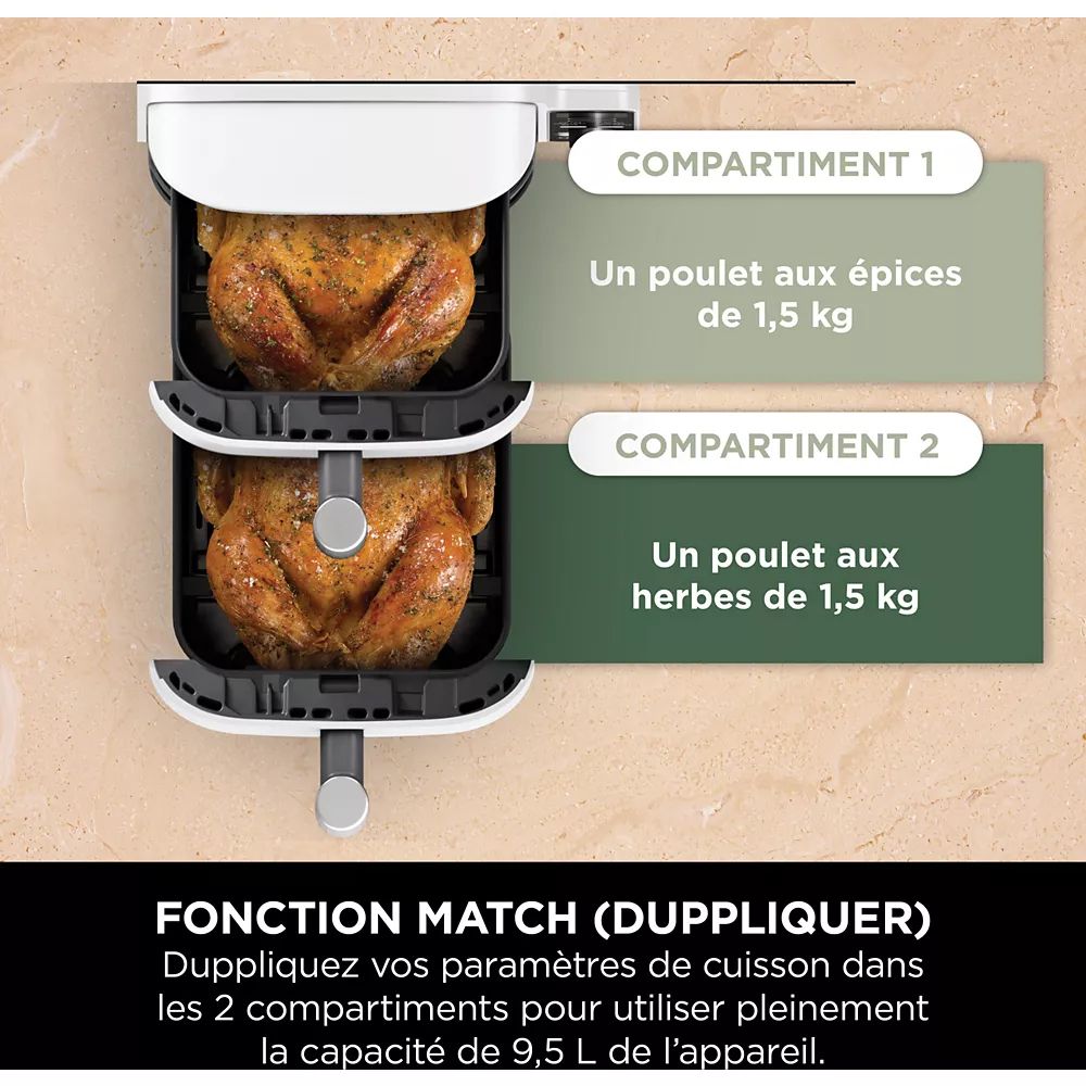 Plus produit Technologie Dual Zone Double Stack : 2 tiroirs indépendants (2 x 4,75 L) pour une capacité totale de 9,5 L, 6 modes de cuisson, température réglable 40°C–240°C, revêtement antiadhésif, accessoires compatibles lave-vaisselle.
