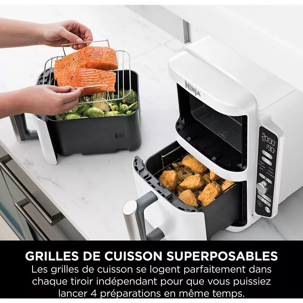 Cuisinez sur 4 niveaux à la fois, pour des résultats au croustillant uniforme. Insérez tout simplement les grilles métalliques Double Stack incluses dans chaque tiroir pour doubler votre surface de cuisson.