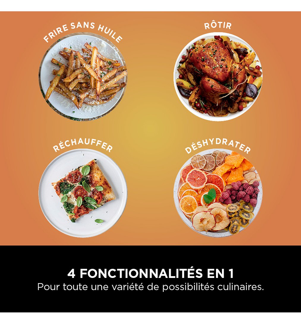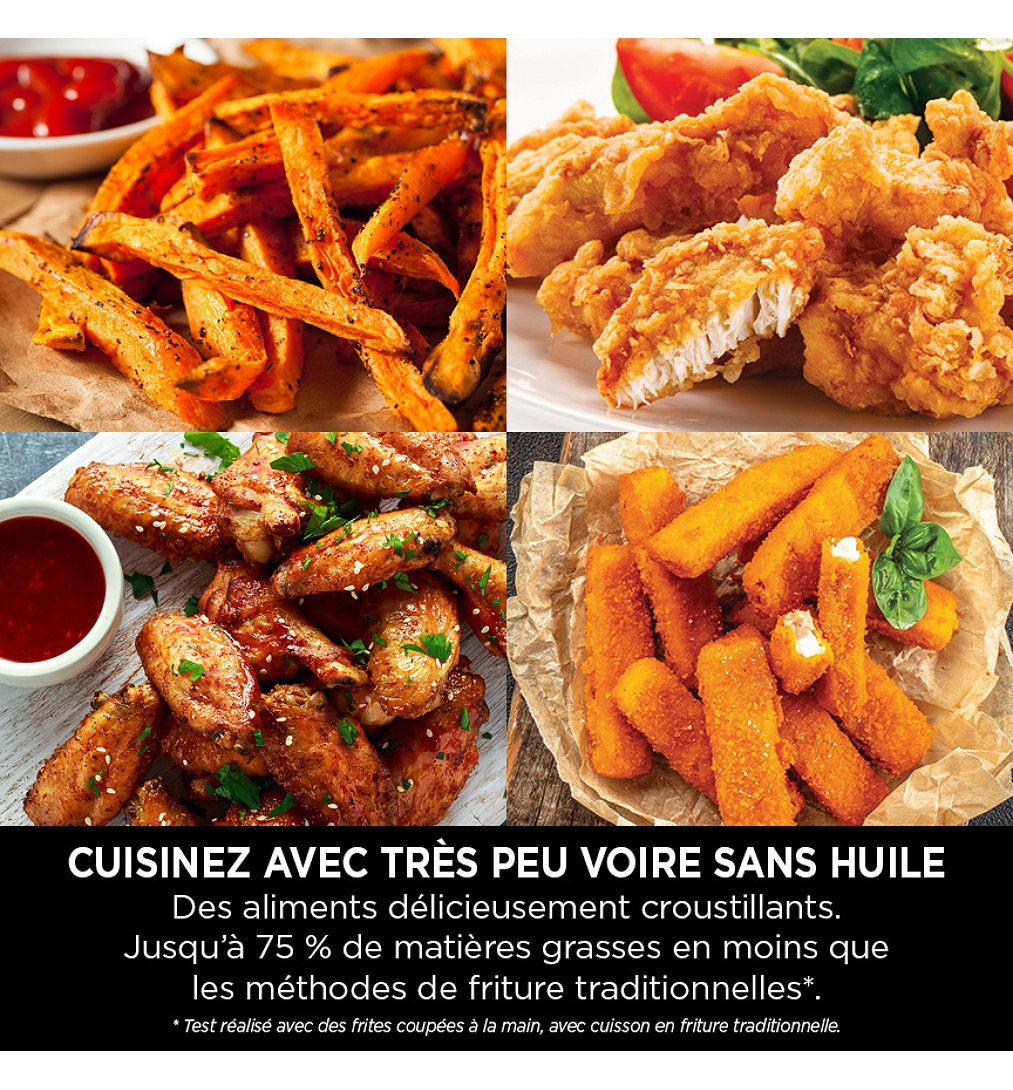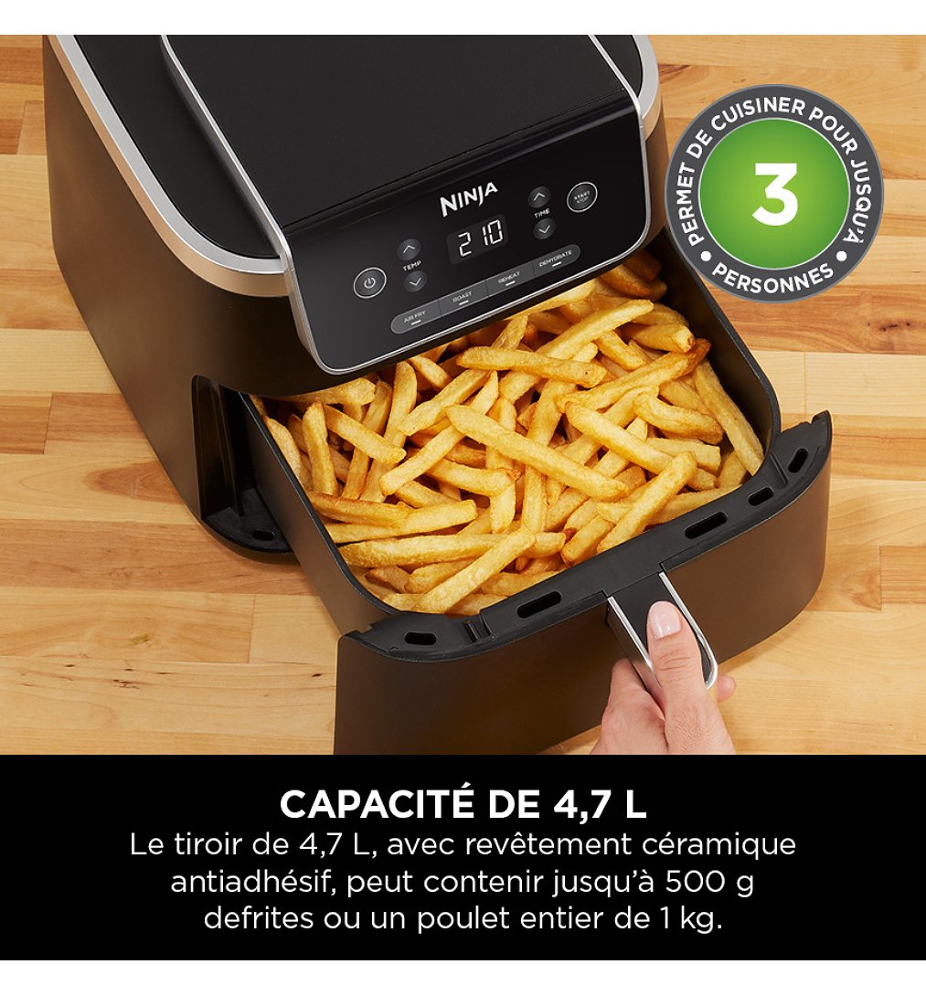 Des aliments savoureux. Sans aucune expérience requise. La friteuse sans huile à tiroir unique Peut accueillir un poulet entier de 1 kg : idéal pour 1 à 2 personnes Obtenez un croustillant parfait jusqu’à 210 °C Cuisinez avec moins d’énergie qu’un four* Une friture plus saine : jusqu’à 75 % d’huile en moins qu’avec les méthodes de friture traditionnelles** 4 modes de cuisson : Air Fry (Frire sans huile), Roast (Rôtir), Dehydrate (Déshydrater), Reheat (Réchauffer)