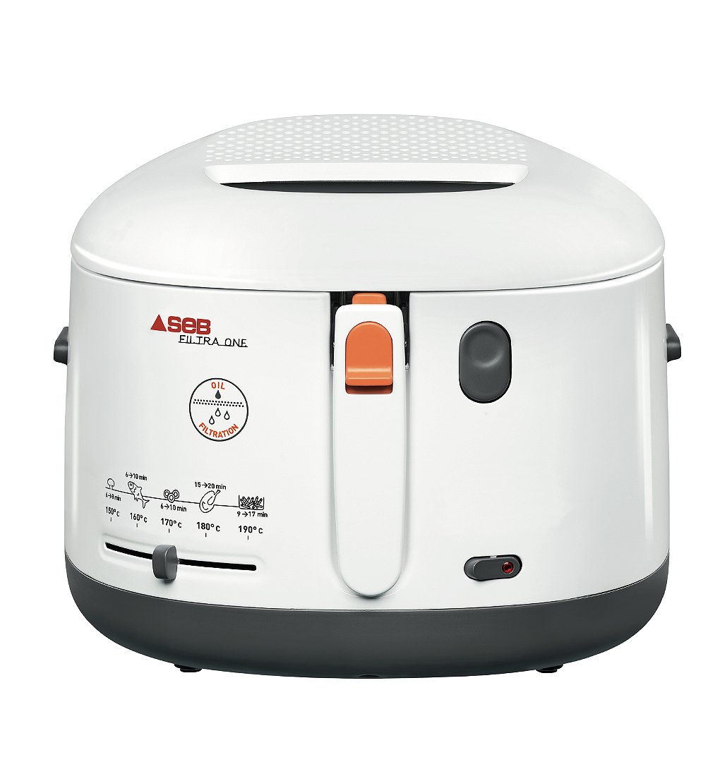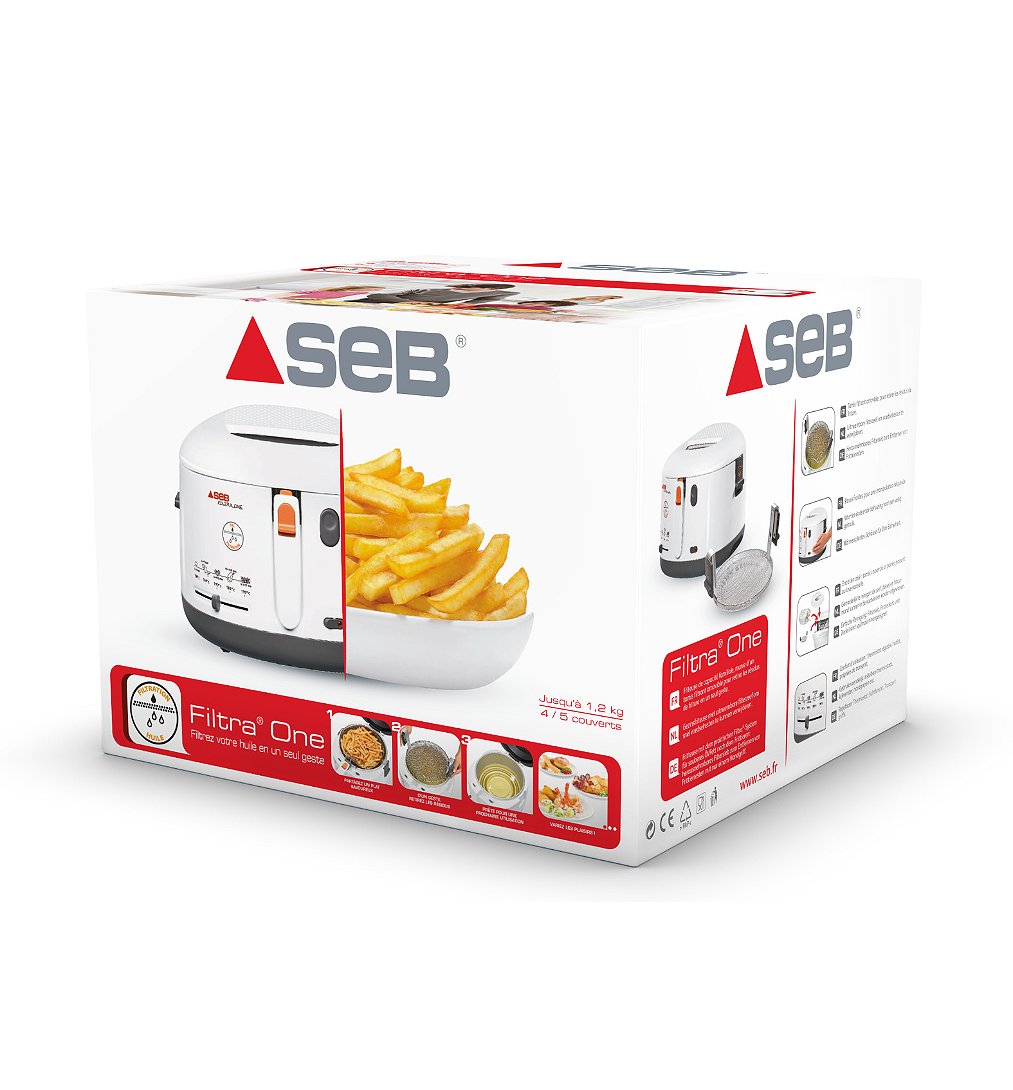 SEB Filtra One. Capacité de la friteuse: 0,9 kg, Capacité en huile: 2,1 L. Type de construction: Unique, Couleur du produit: Blanc, Placement de l'appareil: Autonome. Puissance: 1900 W. Largeur: 340 mm, Profondeur: 330 mm, Hauteur: 260 mm Friteuse Filtra One compact 1.20 kg (4/5 personnes) - Elle vous permettra de préparer des frites croustillantes et savoureuses en toute praticité - Son tamis filtrant métallique vous permettra d'éliminer les résidus en fin de cuisson et de conserver votre huile plus propre et plus saine - Son thermostat sera idéal pour réaliser toutes vos recettes (frites, beignets, nems, tempuras..) - Poignée monte et baisse - Nettoyage aisé grâce au couvercle et panier compatibles lave-vaisselle - Cuve fixe en aluminium - Filtre métallique permanent - Couvercle avec hublot de contrôle.