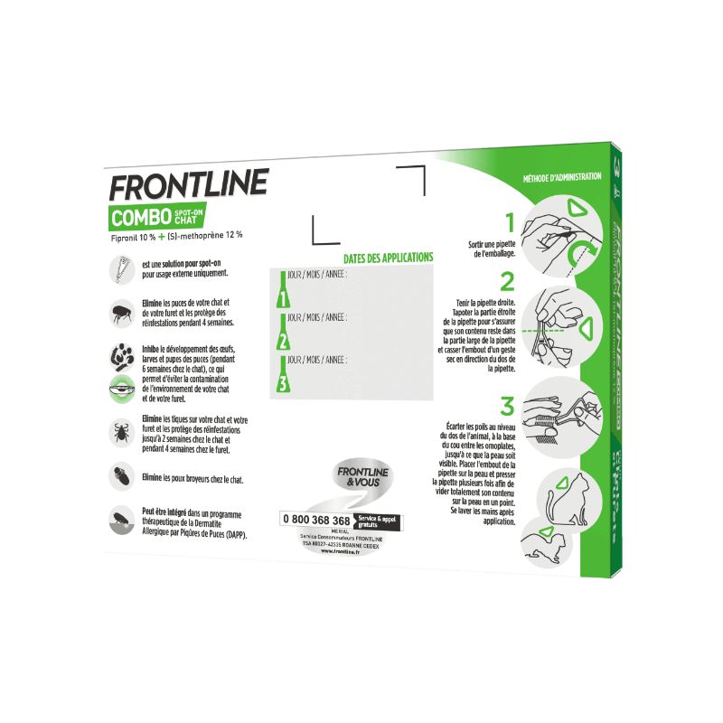 Frontline Combo est un puissant antiparasitaire externe spécialement conçu pour traiter les chats contre les puces, les tiques et les poux. Son efficacité est de 2 semaines sur les tiques et va jusqu'à 4 semaines sur les puces. Frontlien Combo est efficace même sur les larves. Il contient 6 pipettes. Propriétés FRONTLINE Combo assure ainsi une double sécurité : il tue les puces adultes et les tiques sur votre chat et il évite la contamination de l’habitat par les œufs et les larves de puces.