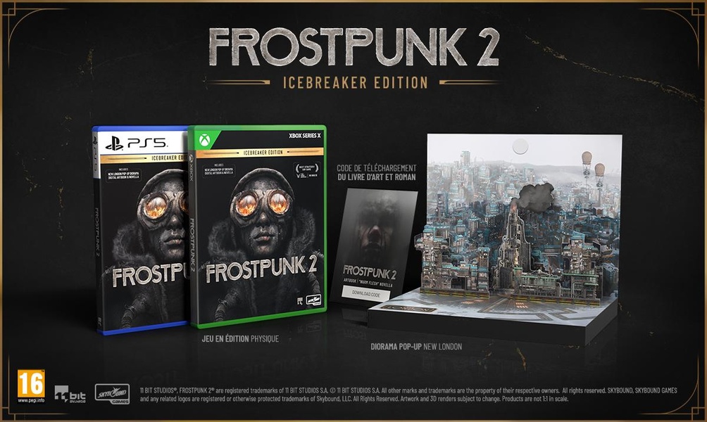 Plus-Produit : L'édition ICEBREAKER (standard) contient : - Un diorama animé de New London conçu avec soin et totalement intégré à l'emballage de manière à pouvoir exposer à tout moment le coeur de la ville glacée de Frostpunk. - Un code de réduction pour l'artbook officiel de Frostpunk 2 qui offre un aperçu exclusif des coulisses de la création du jeu, avec notamment des dessins conceptuels, des esquisses et bien d'autres choses. - Un code de réduction pour la novella Warm Flesh (en version anglaise), une nouvelle prenante qui se déroule dans un monde où le froid n'est pas le seul ennemi à redouter. Développez et élargissez votre ville dans un jeu de survie sociale qui se déroule 30 ans après qu'un blizzard apocalyptique a ravagé la Terre. Dans Frostpunk 2, vous devez affronter les périls d'un hiver sans fin, mais aussi lutter contre les puissantes factions qui surveillent vos moindres gestes dans la Salle du conseil. Frostpunk 2 élève le genre de la survie de ville à un nouveau niveau.