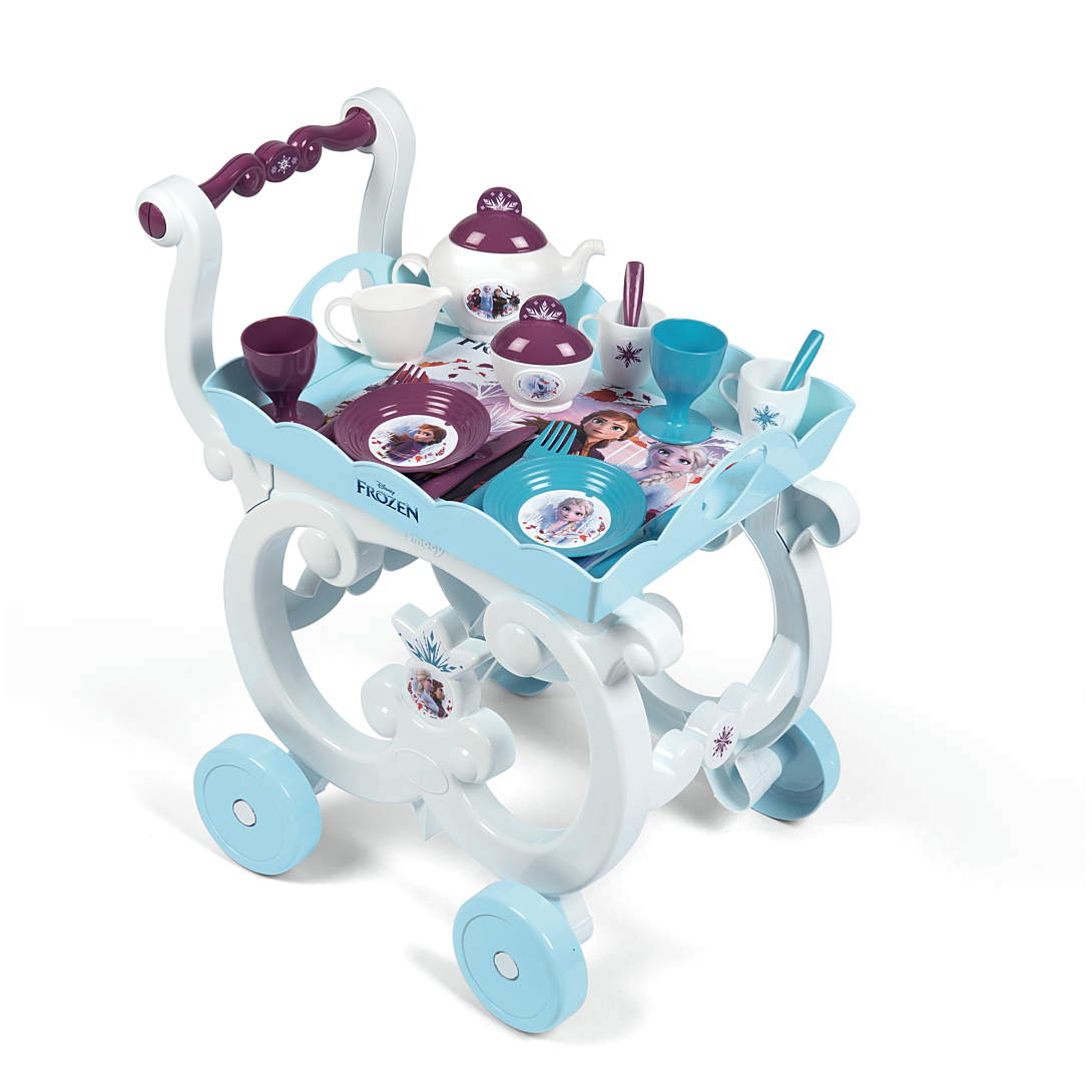 | Plus produit | Desserte La Reine des Neiges 2. Plateau amovible. 17 accessoires : 2 assiettes, 2 verres à pied, 6 couverts, 2 tasses, 1 théière et 1 sucrier avec couvercles, et 1 pot à lait. |