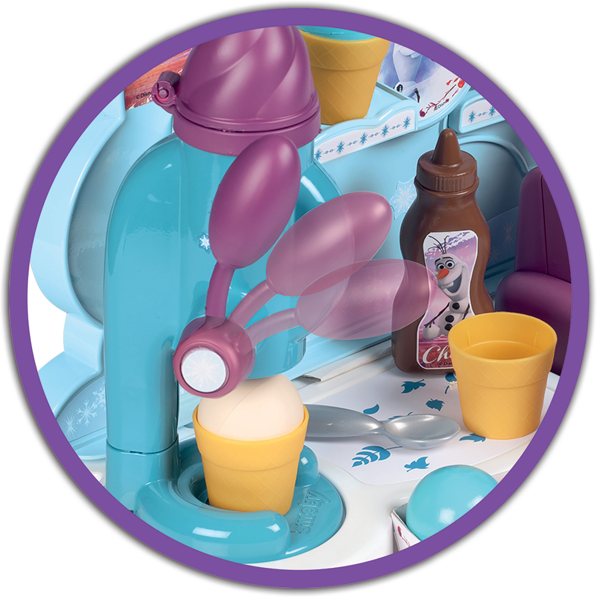| Plus produit | Marchande de glaces Frozen. Caisse enregistreuse, machine à glaces, nombreux rangements. 22 accessoires inclus dont 1 CB, 6 pièces, 2 cuillères... 1 figurine Olaf incluse. |