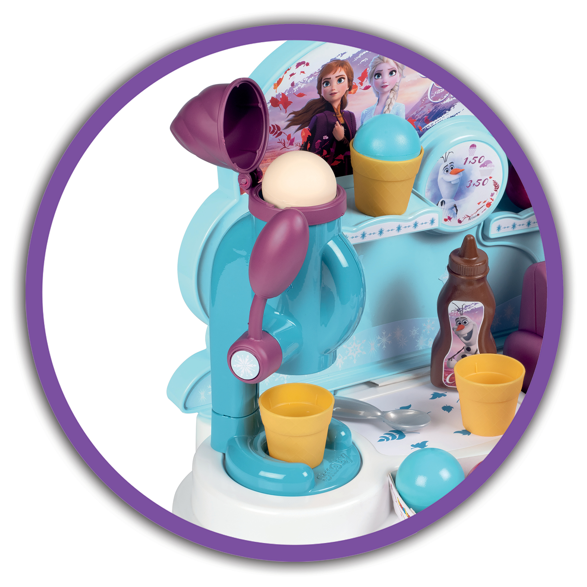 Marchande de glaces La Reine des Neiges avec 1 figurine Olaf incluse. Elle est composée de : 1 caisse enregistreuse, 1 machine à glaces, et de nombreux rangements. 22 accessoires inclus : - 6 boules de glace - 6 pièces - 2 cuillères - 1 carte bancaire - 4 cônes de glace - 1 boite en carton - 2 bouteilles de nappage A partir de 3 ans. Fabrication française.