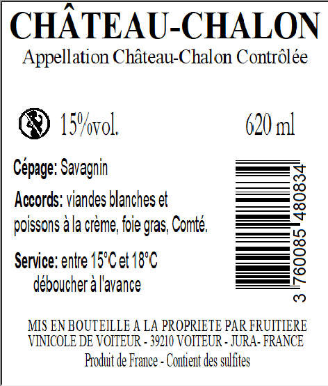 | Libellé | Fruitière Vinicole de Voiteur Château Chalon, 2018 - Château-Chalon AOP - Blanc Sec - 62 cl |